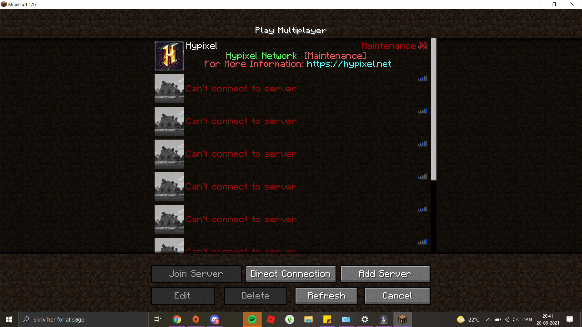 So yesterday while i was playing with one of my friend i left the game to go do something and when i came back i tried to rejoin and couldn't, i refreshed and all of my servers said 'Can't connect to server' and i've literally tried everything i could imagine would help and everything the internet told me to do. Nothing has worked, does anyone know how to fix this, i just wanna play with my friends again.