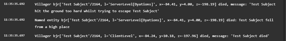 }At the start of the method, a message with two arguments (pairs of curly braces) is printed to the console. The first argument is replaced by Villager#toString, while the second argument is replaced by damageSource.getLocalizedDeathMessage(this).getString(). This doesn't allow for the villager's CombatTracker to check for climbable blocks, and thus death messages for climbable blocks cannot appear. Named entities use this.getCombatTracker().getDeathMessage().getString() for the second argument instead, and this is what should be used for villagers as well.