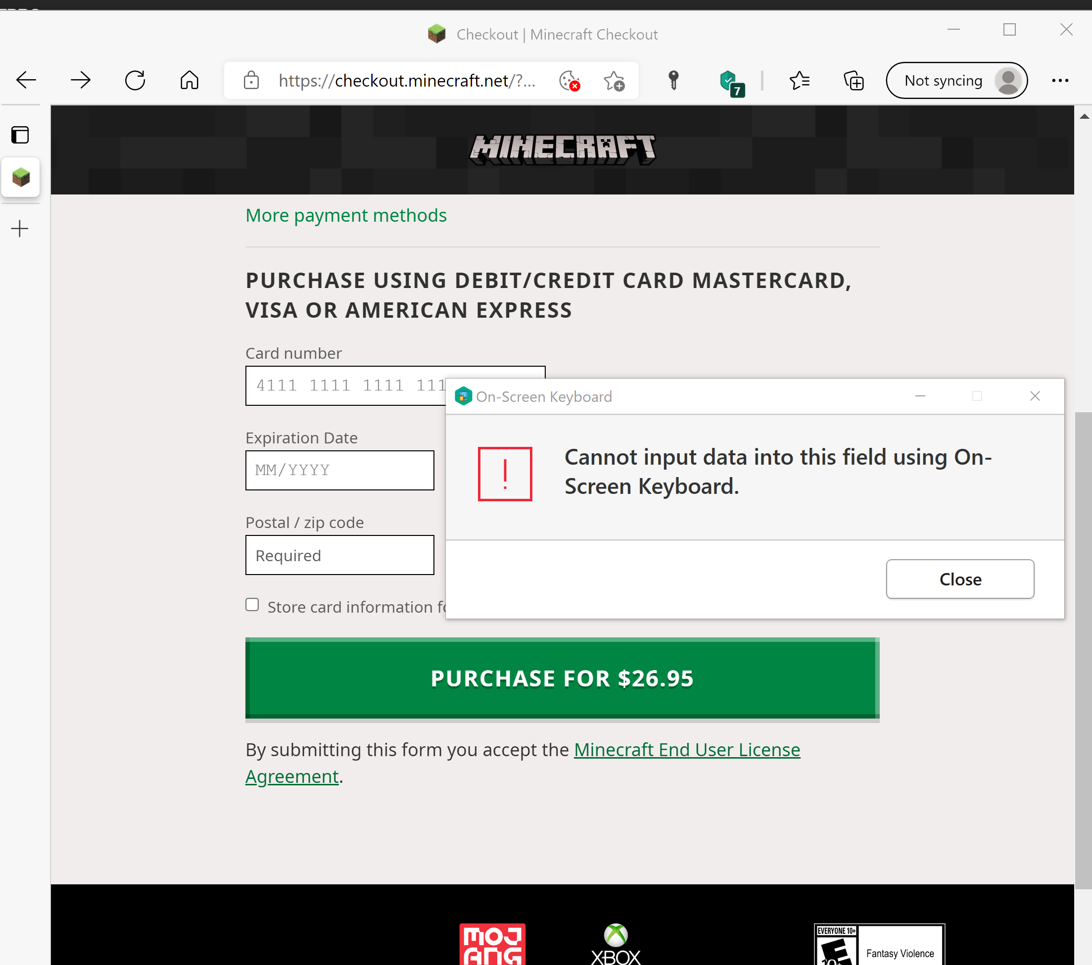 I am unbale to buy Java Minecraft and the issue is during purchase your website is not allowing the anti-virus software virtual key board. The payment site link is having a very less security as highlighted by my anti-virus software.