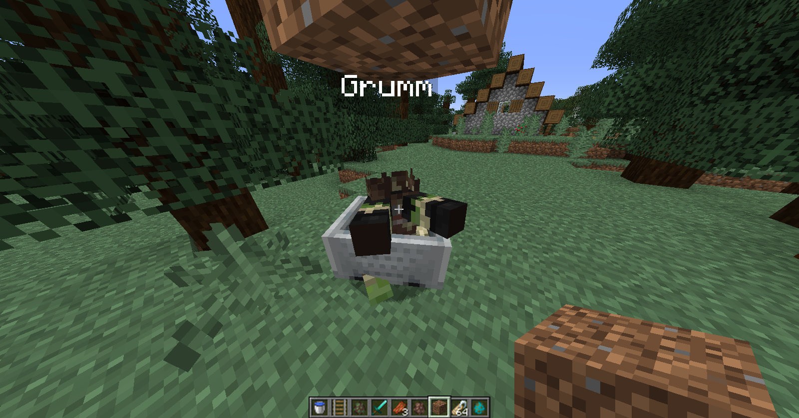 /summon minecraft:minecart ~ ~ ~ {Passengers:[{id:"zombie_villager",CustomNameVisible:1b,CustomName:'{"text":"Grumm"}'}]}Expected Result