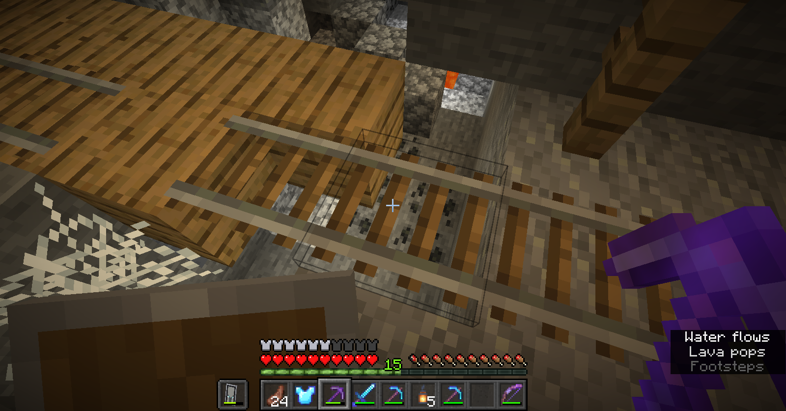 I was exploring the new chunks of my Minecraft world and I found a mineshaft. as I was walking in one of the floating mineshaft levels with the chains holding it. I fell down to my death and when I got upstairs again I saw that the rail was floating