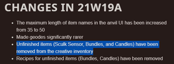 Unfinished items (sculk sensors and bundles) have been removed from the inventory as they are unfinished. This "Works As Intended" as stated in the 21w19a changelog.
