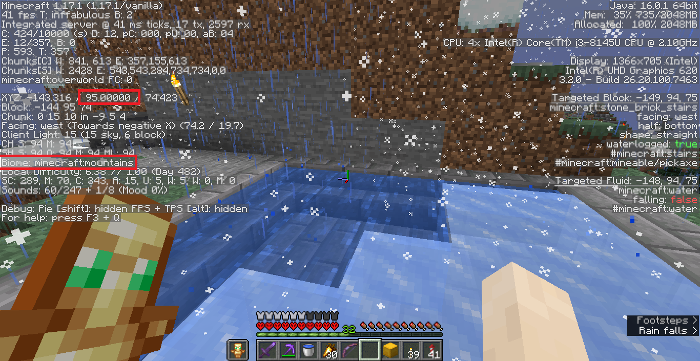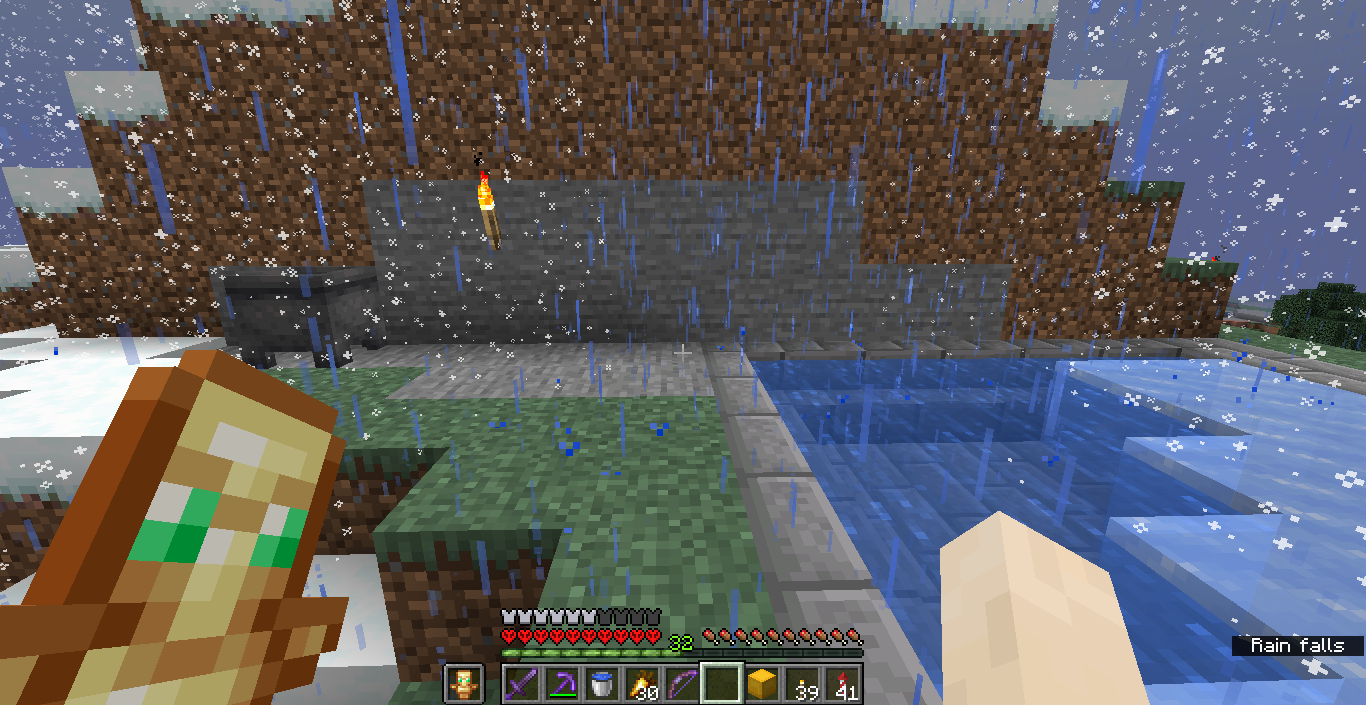It's rainning in a particular area, on a moutain biome at Y=94, where it should be snowing, causing the water to not freeze.