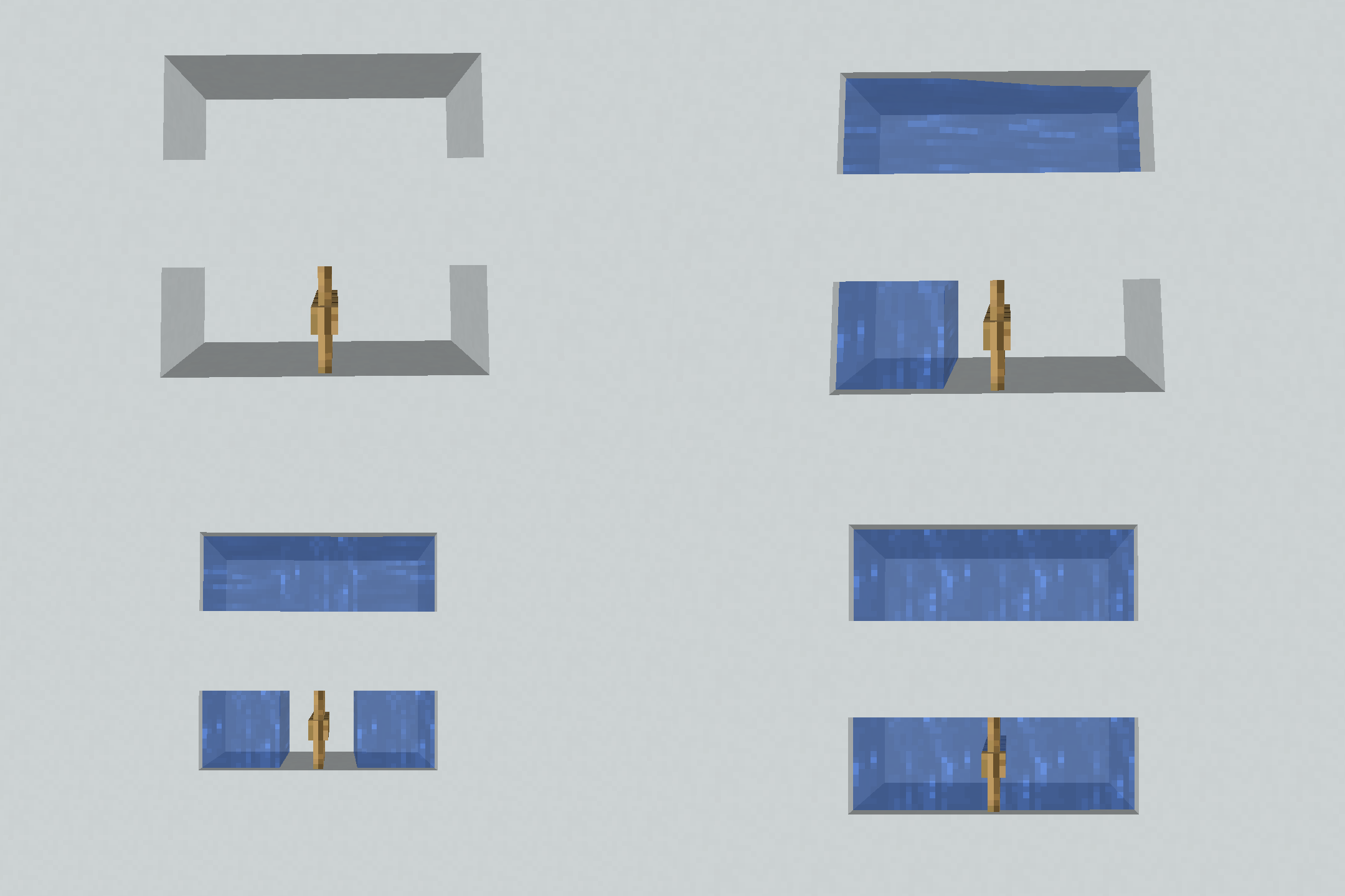 expected outcome: in the trench with no waterloggable block, two water sources flowing freely create a third water source in the middle of the trench. in the other trench, the waterloggable block in the middle of the trench prevents two water sources from meeting, thus nothing will happen.