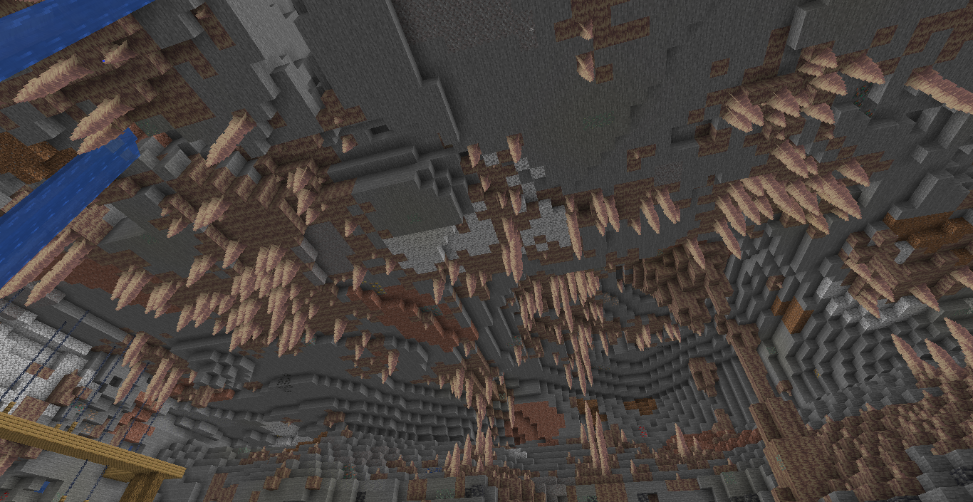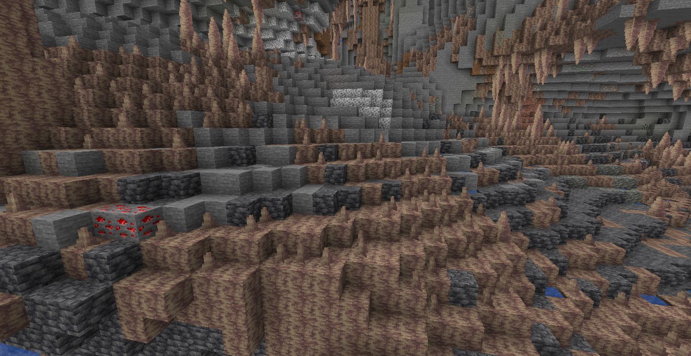 As the summary says, pointed dripstone clusters tend to generate too much frequently with thickness "tip" (smallest) on really big caves. From what I've noticed, it occurs when these clusters mostly don't have stalactites above them within a noticeable range, but i might be wrong tho. This doesn't happen on ceiling clusters or inside small caves (at least from what I've seen).
