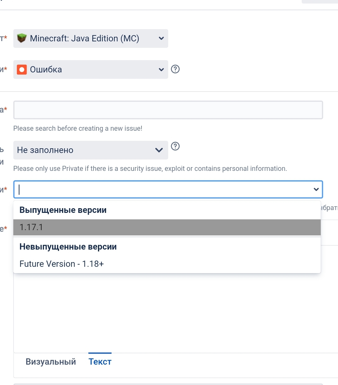 when I started reporting bugs, I noticed that I can't install other versions of Minecraft(You can only install 1.17.1 or 1.18). Because of this, the version of the bug does not match the version on which the bug was detected