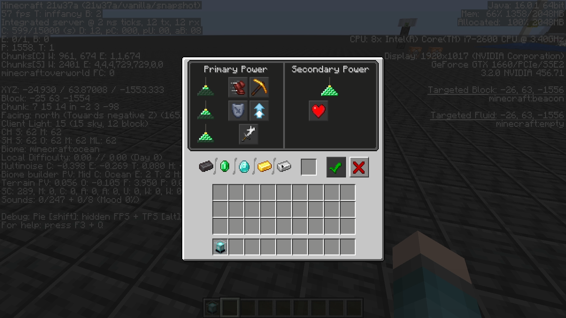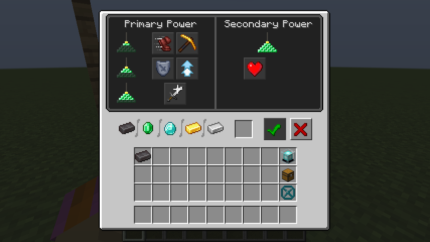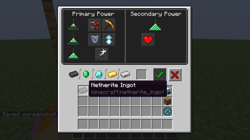 Unlike items in the inventory, moving the mouse over one of the five item icons in the beacon will cause absolutely no info on those items to be displayed. Contrast this with villager trades, in which items that can be traded can in fact be highlighted, giving all the information highlighting an item would, as well as recipe books, where info on items is also shown.