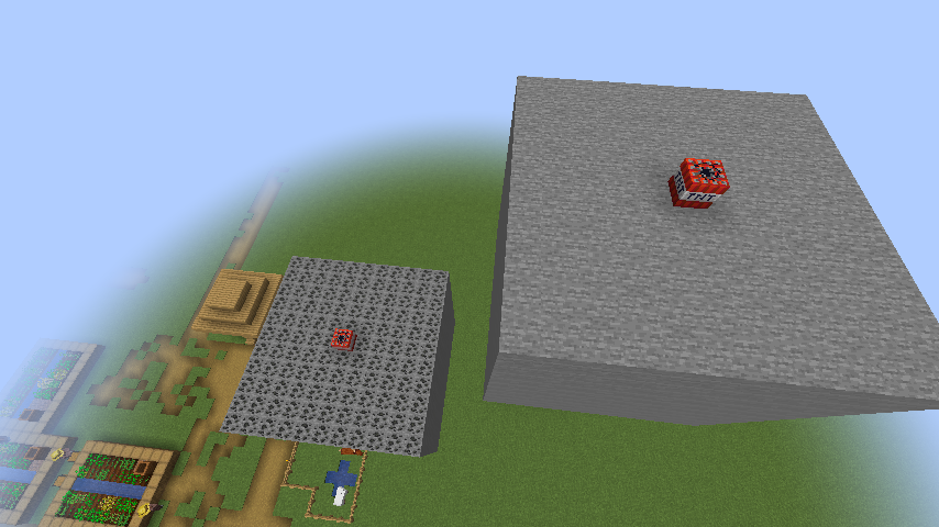 /fill ~-1 ~ ~-1 ~-9 ~5 ~-9 minecraft:stonePlace some TNT on top and in the center of the two big blocks of stone and diamond ores. See