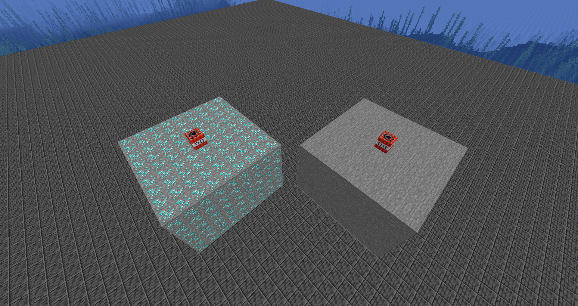 → ❌ Notice how more of the diamond ores are destroyed compared to the stone, therefore indicating that ores have lower blast resistances than stone, despite taking longer to mine or even requiring higher tools.
