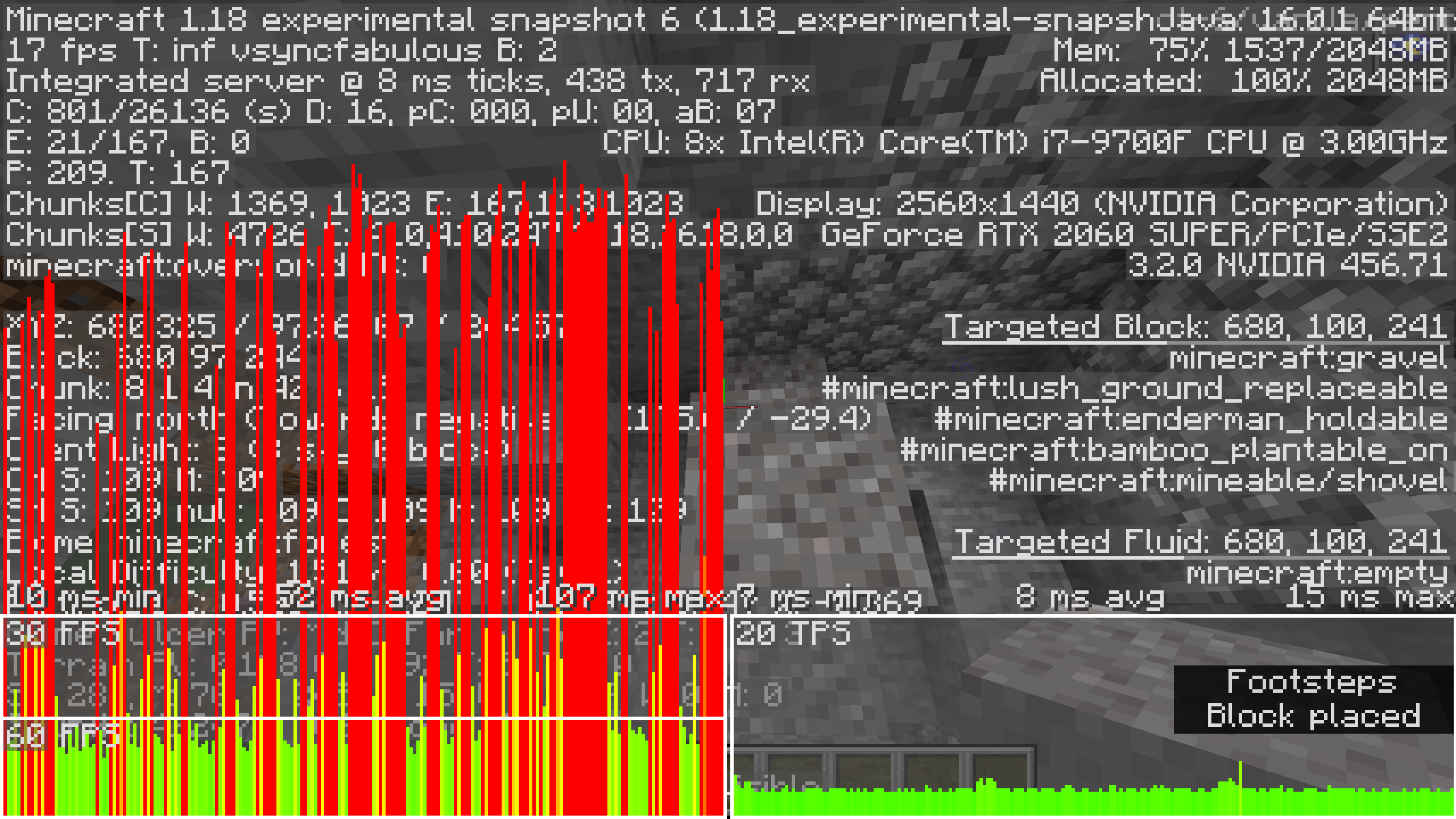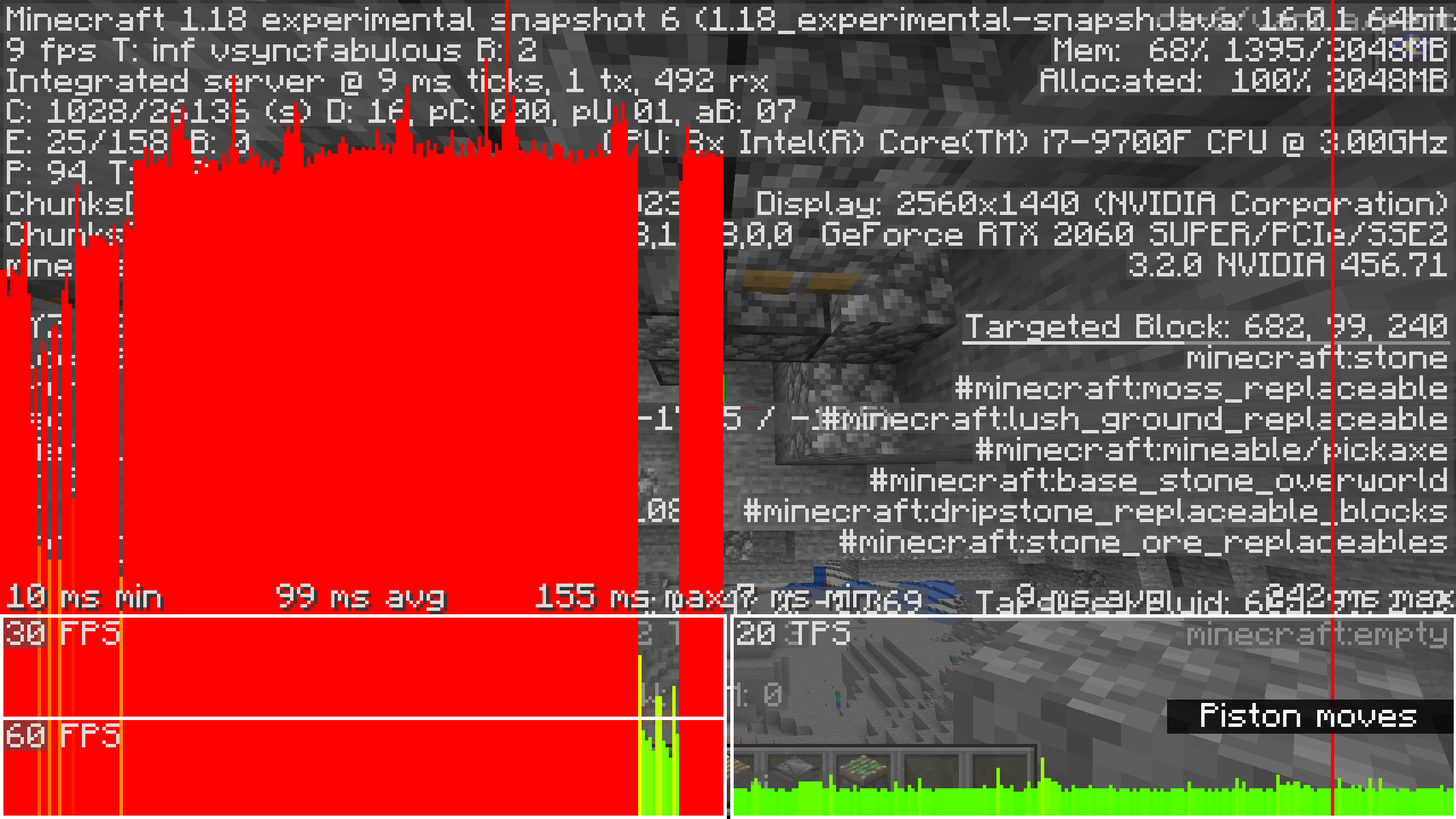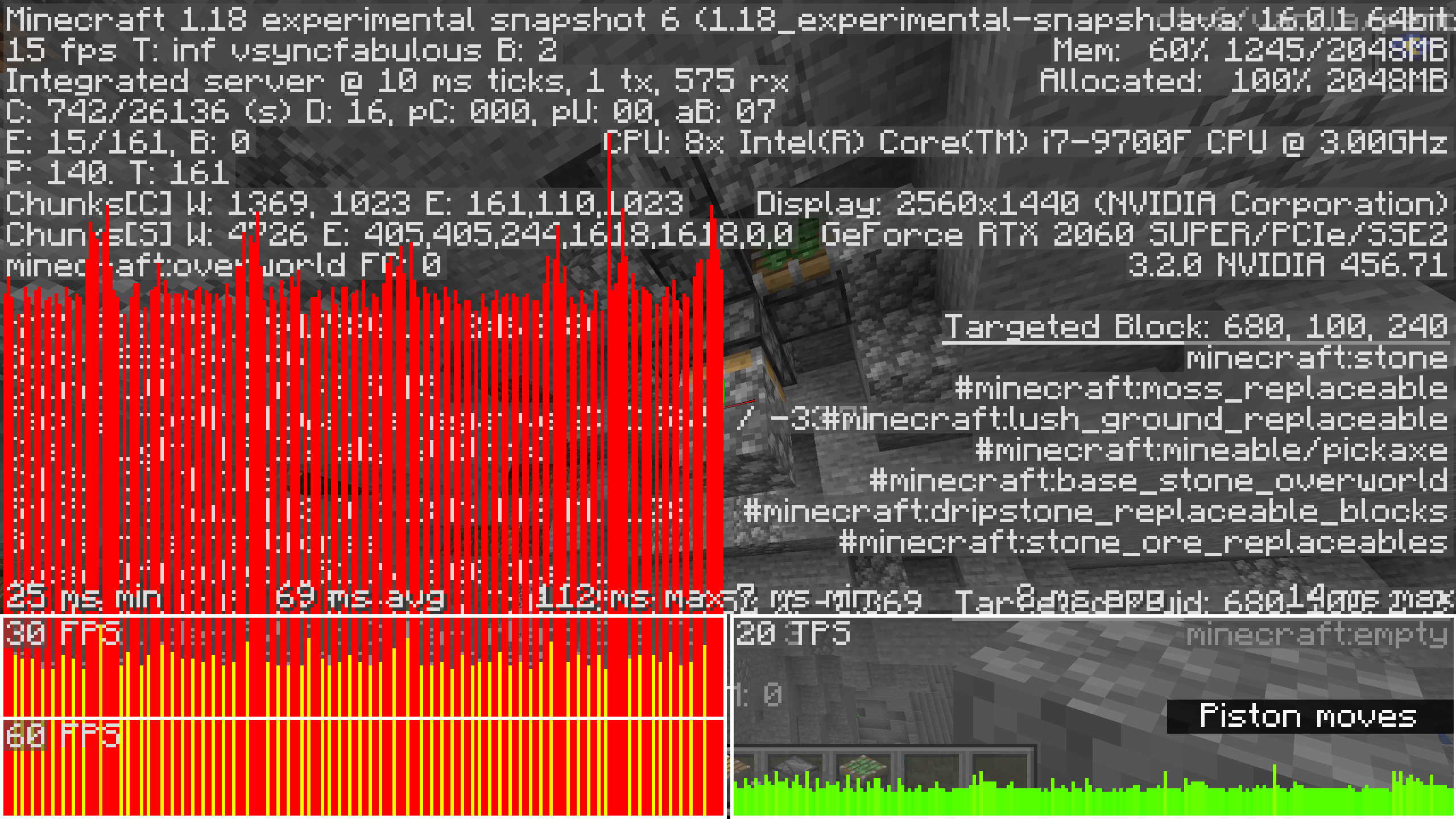 I encountered some severe performance issues after setting off large (power 50) fireball explosions in experimental snapshot 6. After having done so destroying or placing blocks or causing general updates will either occasionally cause major frame drops or consistently causes them in certain locations. It's likely not unique to these exact circumstances and is more a general performance issue but in certain circumstances this causes severe performance issues with as little as 4 pistons and 2 observers (debug screenshots included).