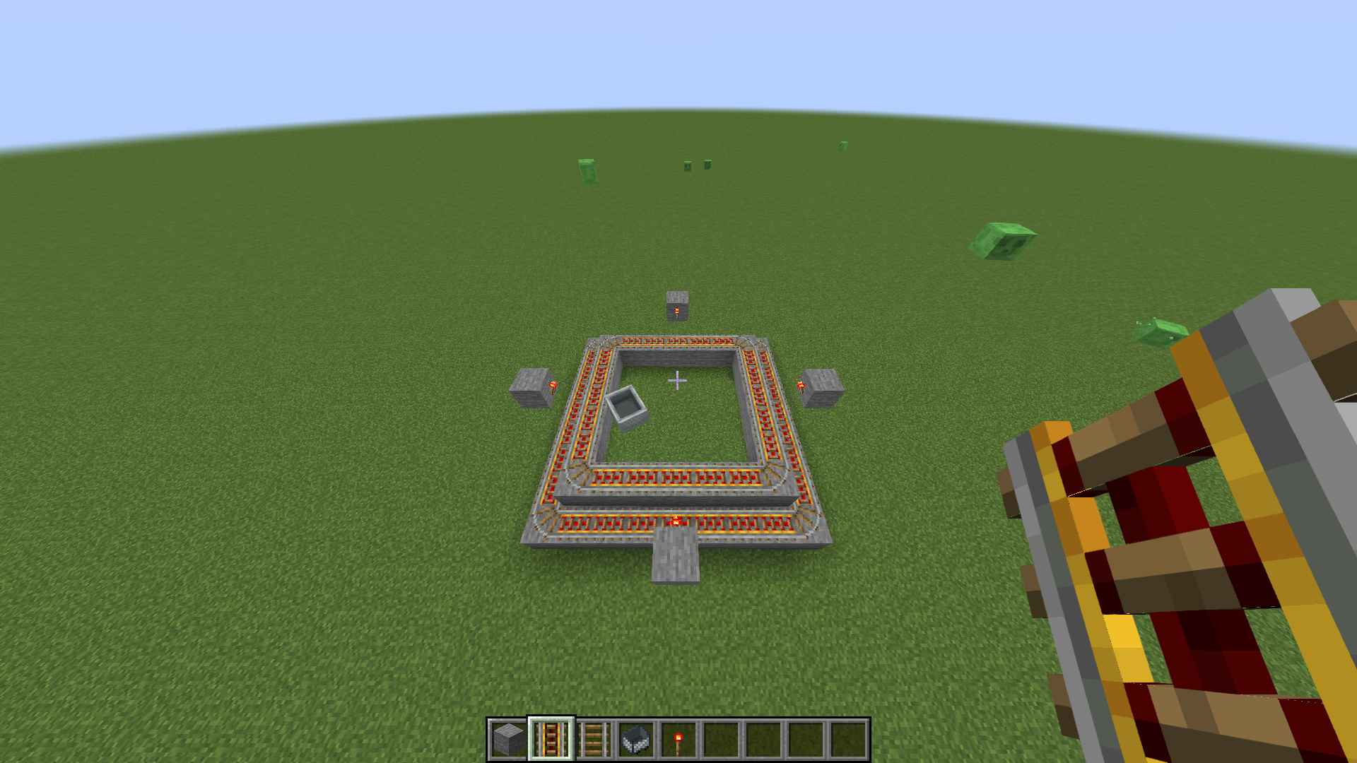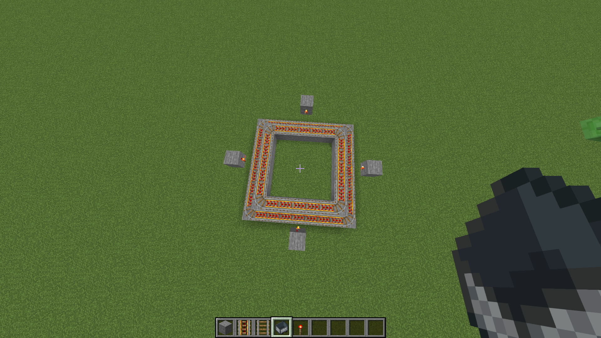 1. Make a square with rails, place a Minecart, make it move and a block under that square of rails forms another square of rails