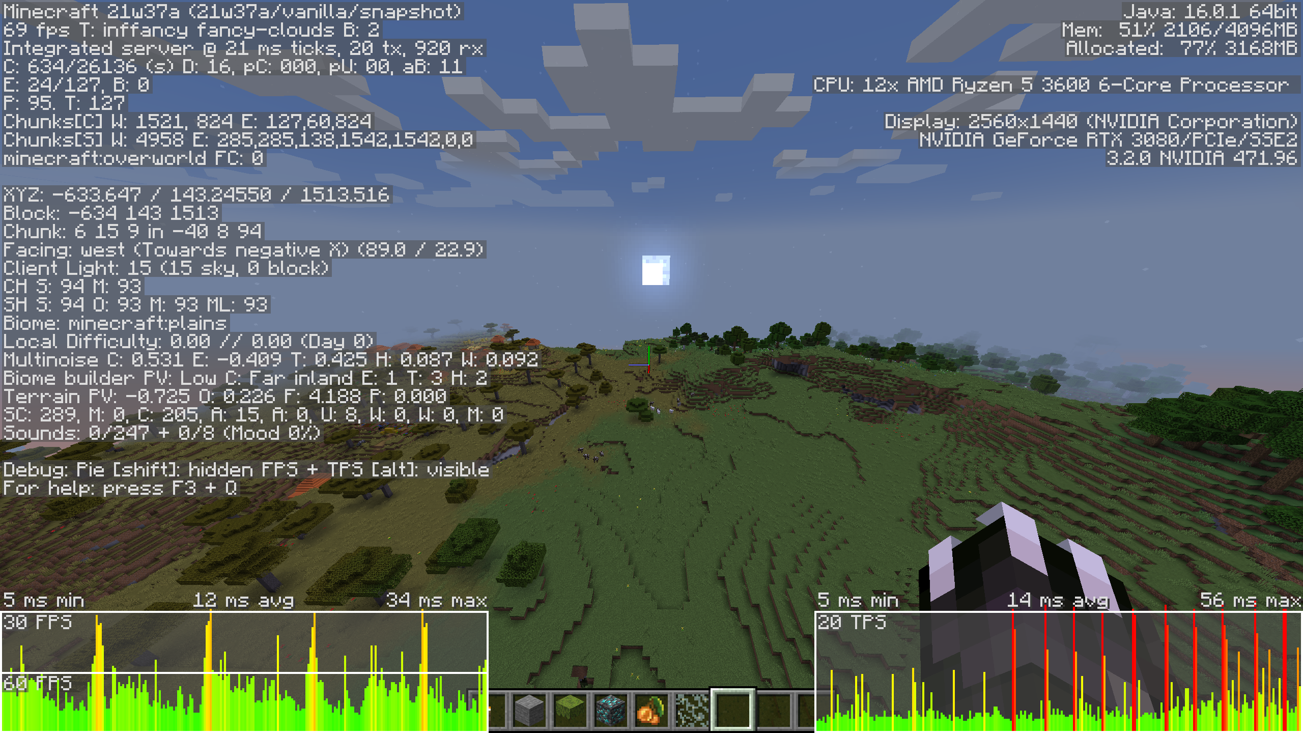 When crossing chunk borders I experience harsh spikes in frame time, which are visible in the Alt + F3 graph. These spikes occur every time without fail. They seem to happen everywhere whether I'm in the sky, on the surface, or underground. However, I've noticed the spikes are significantly worse on the surface compared to when I'm underground. For some reason I experience extremely poor performance on the surface (between 60-120 FPS) compared to when I'm underground or tunneling (between 800-1200+ FPS), which is a bit strange as I'm running one of the most high end setups available. Below I've provided a screenshot of how the spikes appear in the frame time graph along with my PC specs. I've also included a screenshot of my task manager which shows I'm getting incredibly high CPU usage, which I've never experienced in prior versions of MC.
