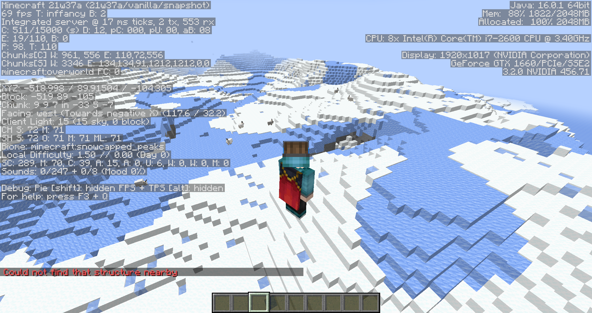 /locate igloo→ ❌ Notice how igloos don't generate in snowcapped peaks, lofty peaks, and grove biomes.