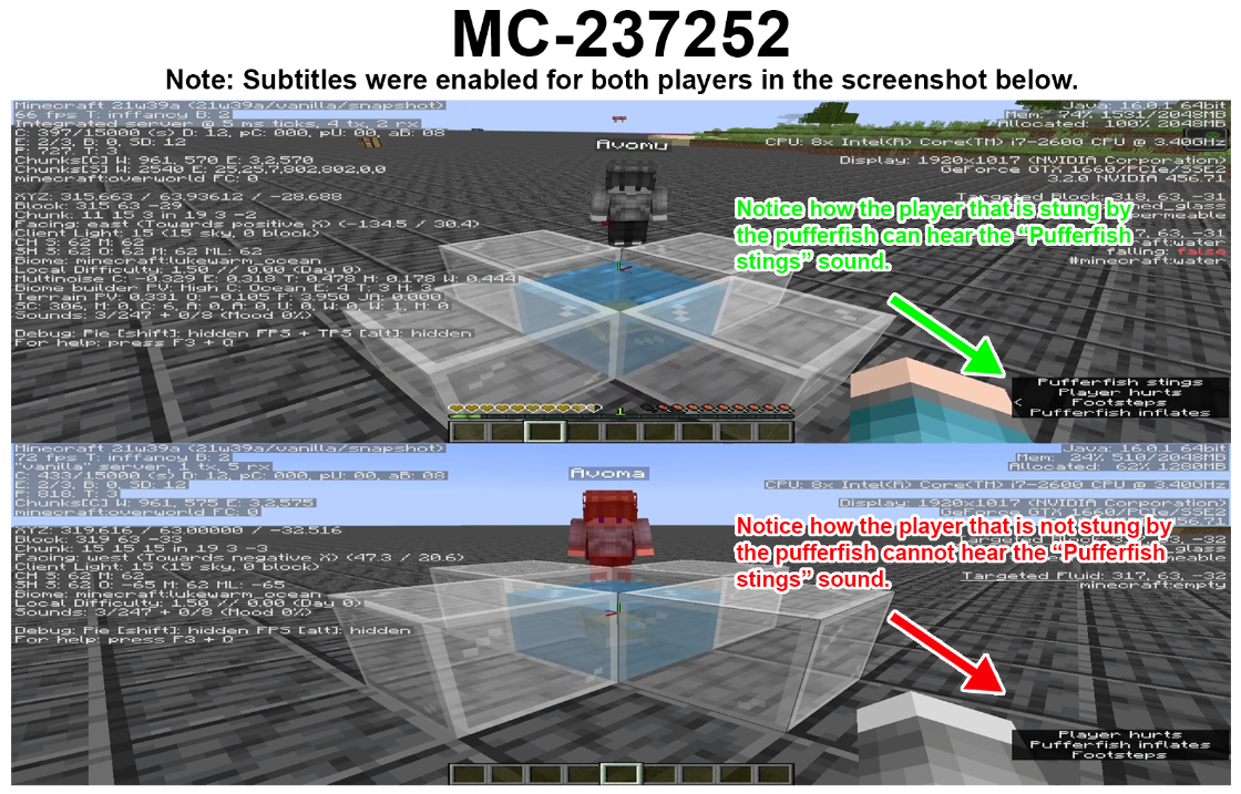 Take note as to whether or not the "minecraft:entity.puffer_fish.sting" sound can be heard by other players when being stung by pufferfish.