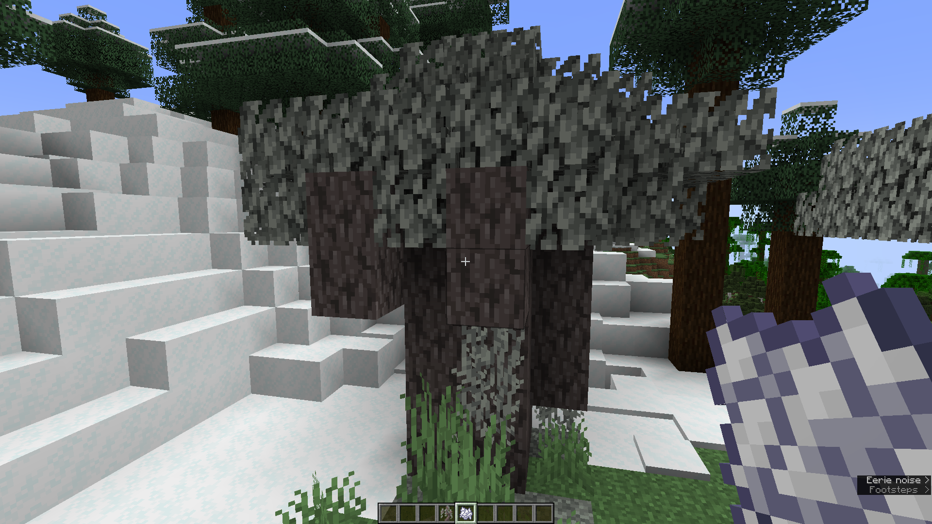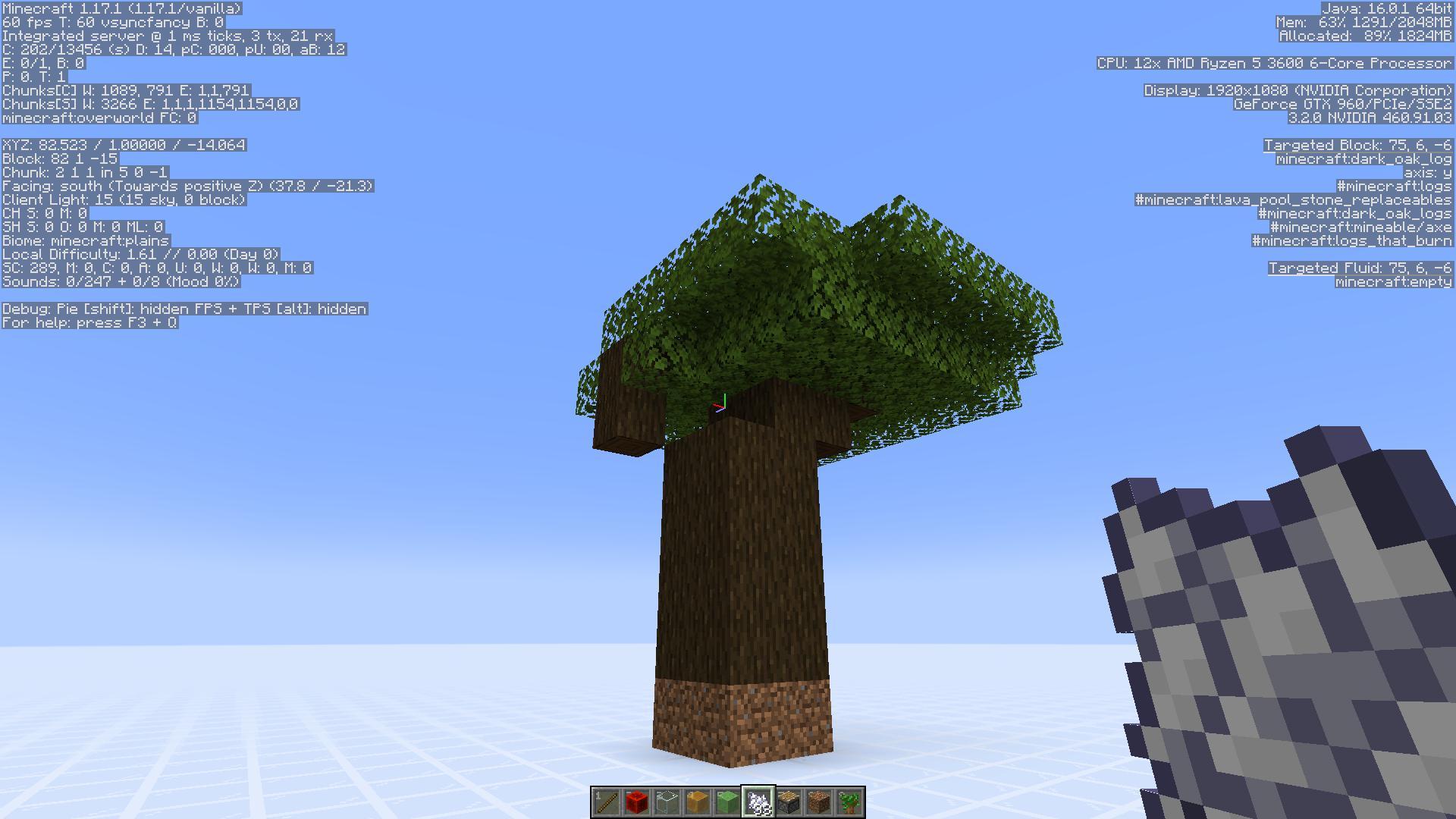 This is also inconsistent with acacia, large oak or large jungle trees, which all correctly place their additional sets of leaves at the end of their branches. For visualization purposes I've attached a screenshot of a dark oak tree with a maximum bend towards the west and a branch in southeast direction. As you can see, there are some additional leaves on the lowest leaf layer towards the southeast, but they do not enclose the end of the branch, which is even exposed on its eastern side, as its corresponding leaves are needlessly offset towards the west by two blocks.