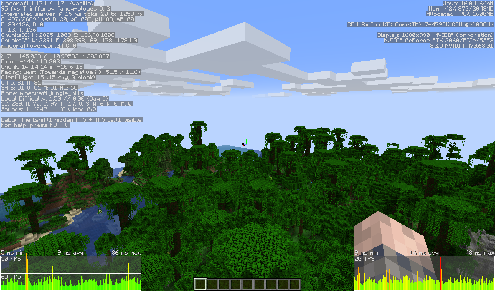 I was not able to test each version on the exact same map due to seed weirdness, so 1.17.1 is in a different spot, but one that should be even more GPU heavy than the scene in the snapshots, yet performs way better.