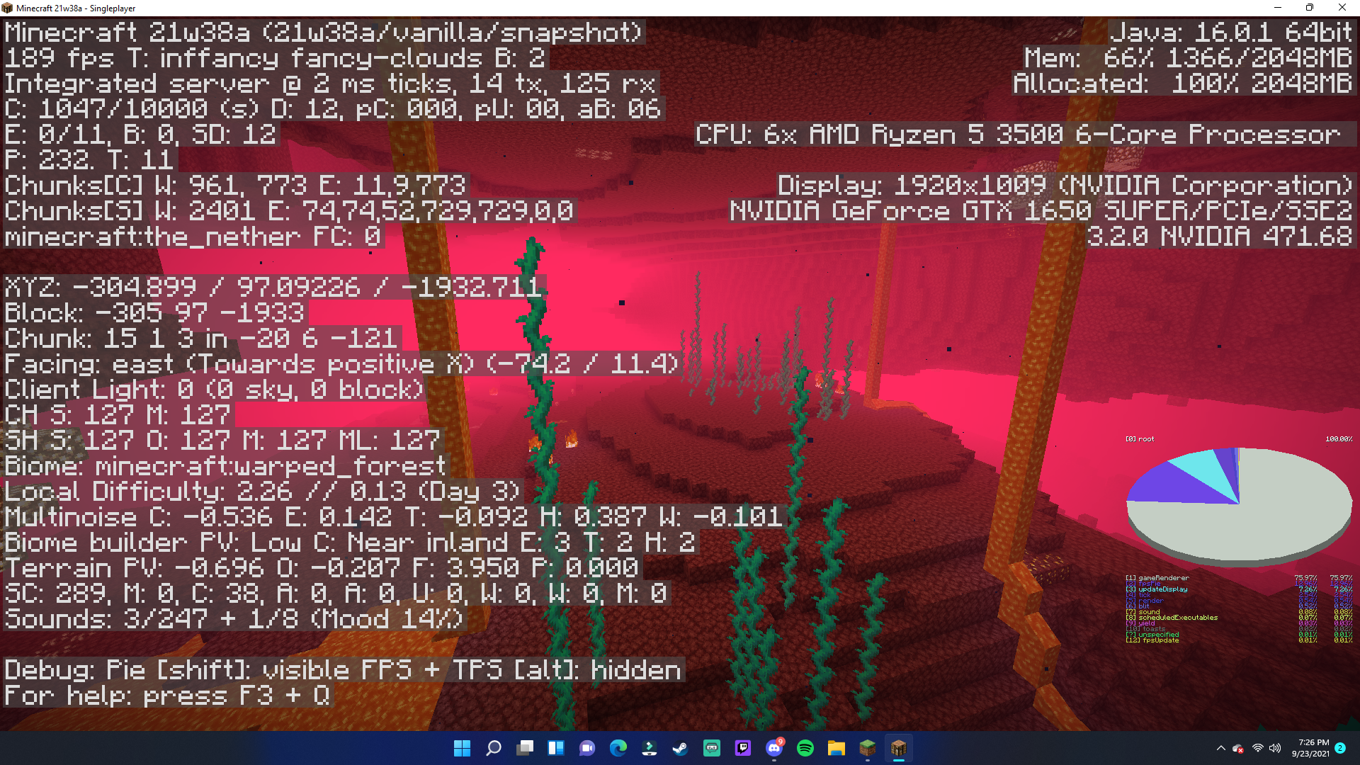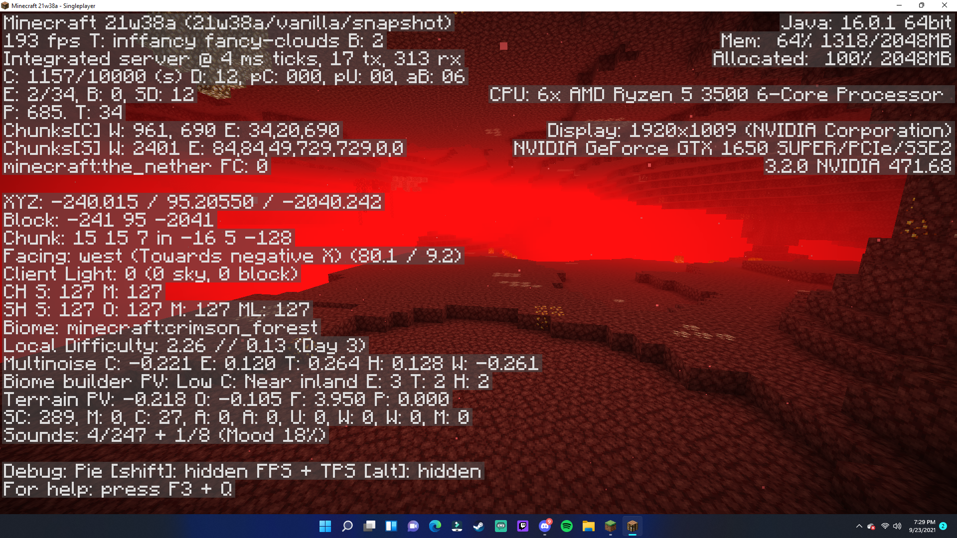 I have been messing around in the new Minecraft snapshot. I'm not entirely sure if the developers are already aware of this or not, but when I walked into the Nether to see if any generation has been unintentionally changed, there appears to have been. None of the Nether biomes (besides the Basalt Delta) has actually generated in the Nether. The Nether Fortresses and the Bastions are left untouched, but the Nether biomes have sort of been wiped away, the only things that exist withing the biomes are the twisting vines and weeping vines. (and of course the basalt pillars for the soulsand valley)
