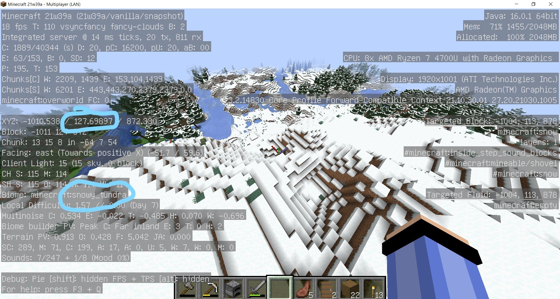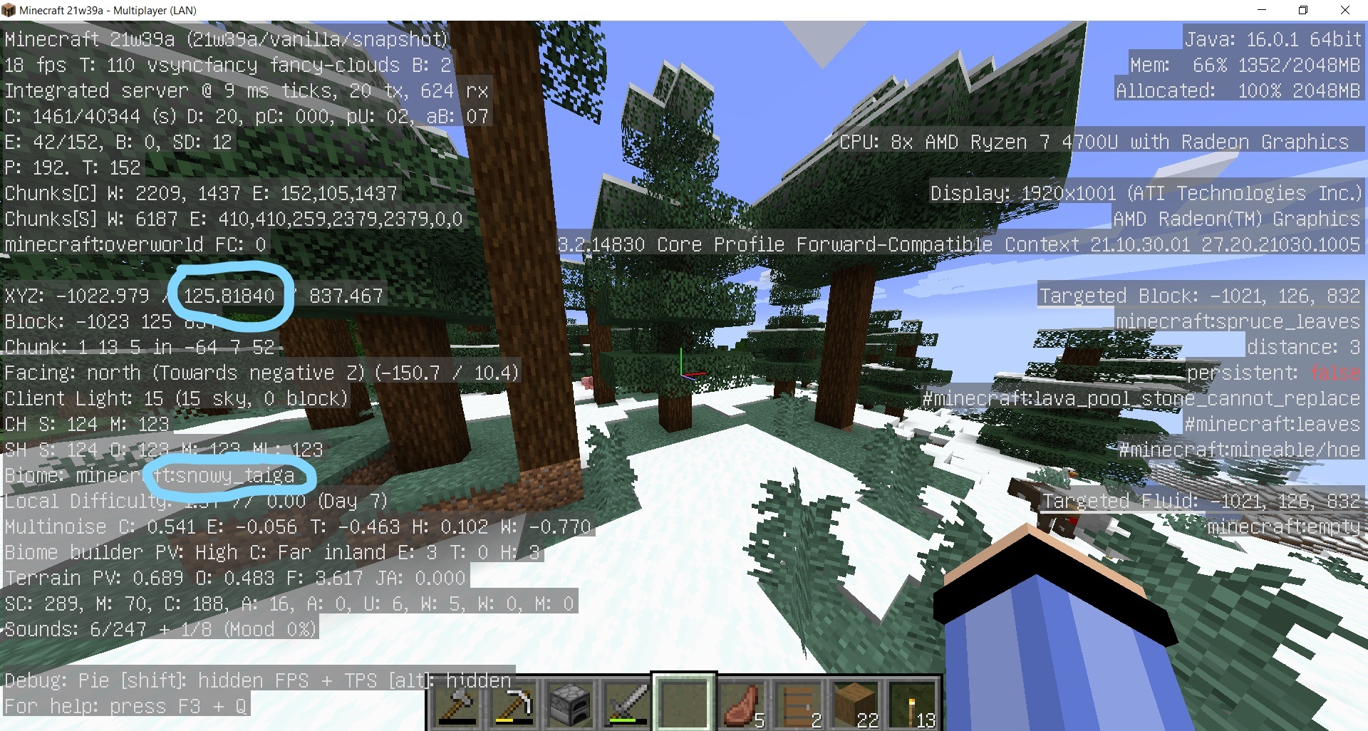 Playing in a survival world, I come across a snowy mountains biome in 21w39a, but for some reason the game doesn't think it's there and instead thinks it is a snowy tundra (which it's not). There is a snowy taiga directly bordering it at the top, but a regular snowy taiga surely doesn't generate at y=120+. This weird patch of land has the exact same traits as a Snowy Mountains, but the game says there's no nearby tall/mountain biomes at all (including Snowy Mountains).
