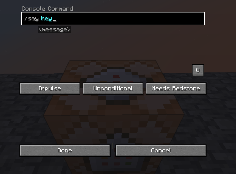 •Write down a command in the command block, for example '/say hello!'