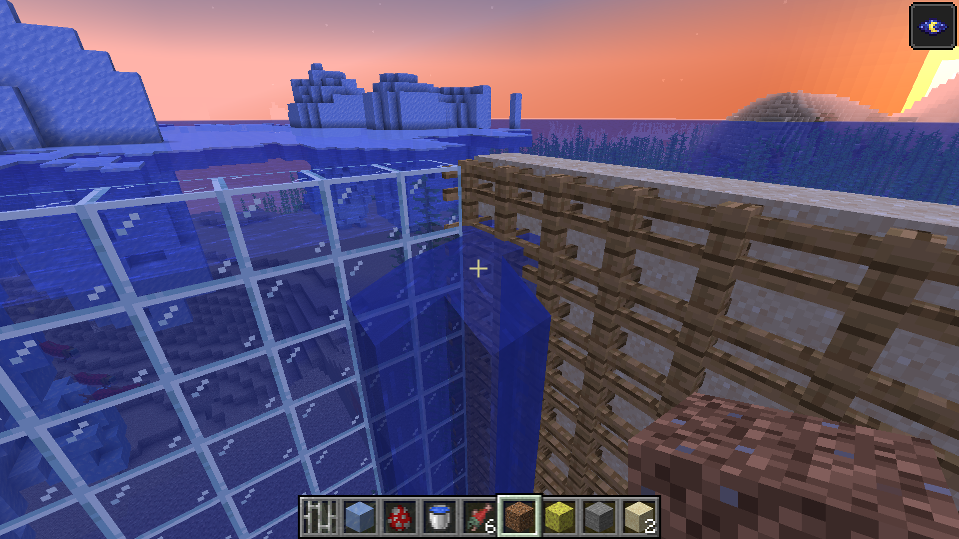 When filling in oceans with iron bars or fences water spawns inside the bar/fence. Even once filled in by a normal block and swapping back the water respawns inside.