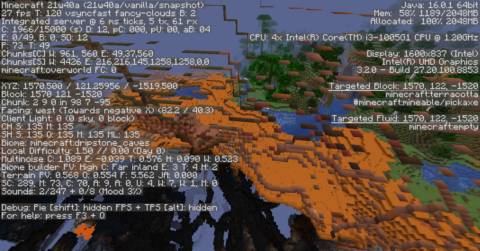 As stated earlier, this might be because there is a dripstone cave biome below the block. However, if this procedure is repeated, except that you run "/teleport @s 1570 140 -1520" instead ofย "/teleport @s 1520 70 -1520" in step 3, then the block you are over will be a badlands biome and will not receive rain, despite there being a dripstone cave biome underneath. This means that the rain may not be related to the dripstone caves.