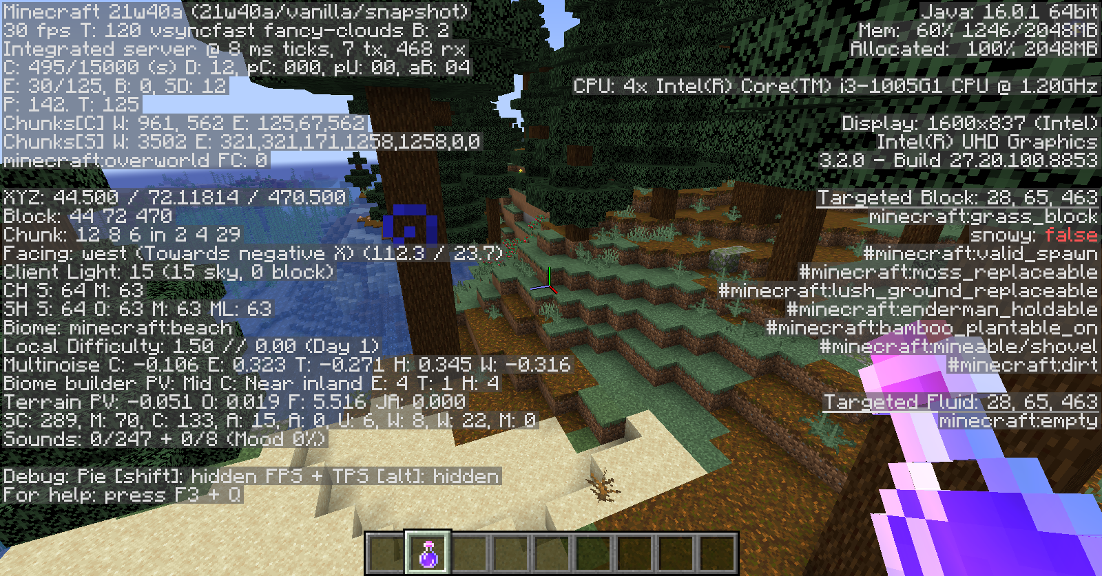 This is different from the non-cave biome overlap issue found in 21w39a and before. In these versions, the overlapping biomes extended far into the "original" biomes, while in 21w40a, this overlap only occurs at the biomes edges. This means that if you were to walk a few blocks into the aforementioned taiga, it would no longer overlap with any non-cave biomes.
