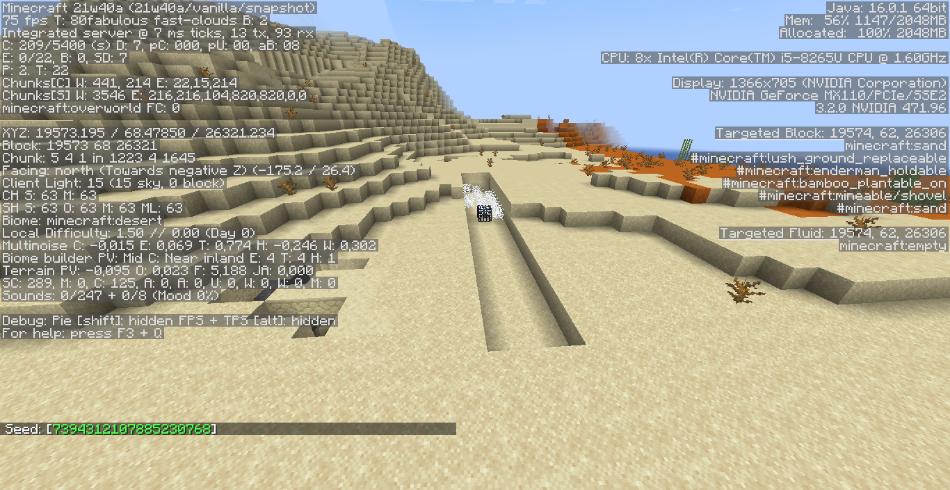 Coordinates: /execute in minecraft:overworld run tp @s 20517698.93 66.00 2736.67 -332.66 16.27I have seen this bug three times in version 1.18 on the seed "-3557984241231373185", including in the badlands biome located at spawn (coordinates: -110, 69, 142)