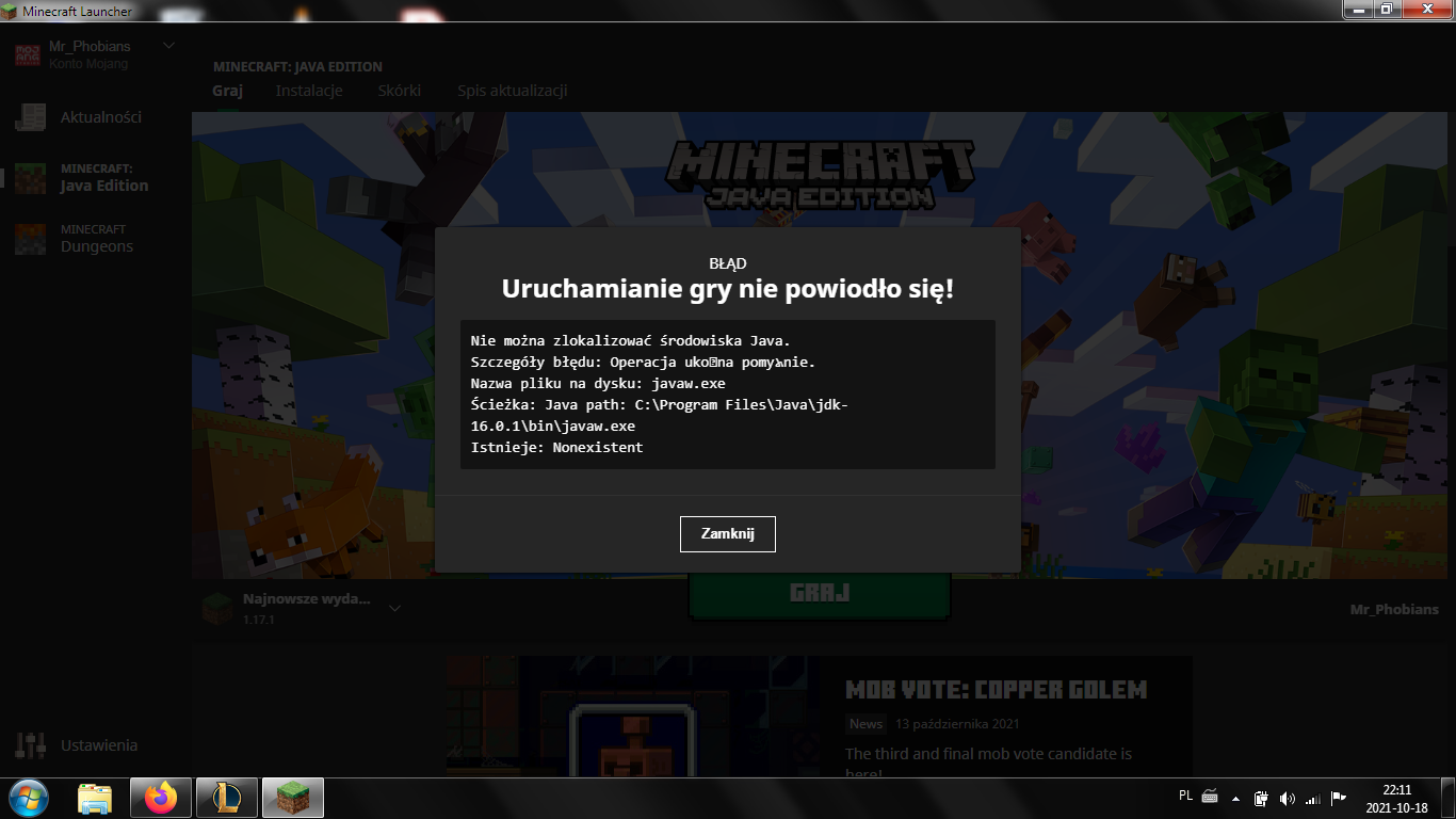 I don't know how to fix this problem. Translation of the message: Error! Failed to start the game! Could not locate java. Error Details: Operation completed successfully. Disk file name: javaw.exe. Path: Java path: C: \ Program files \ Java \ jdk-16.0.1 \ bin \ javaw.exe. There is: Nonexistent.