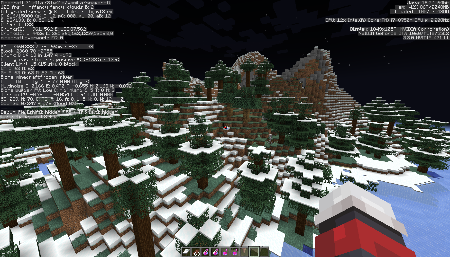 The Windswept Forest biome is merged with the Snowy Plains biome. It is not normal for this to occur, I hypothesized that it may be the cause of the glitches in world generation of the world seed.