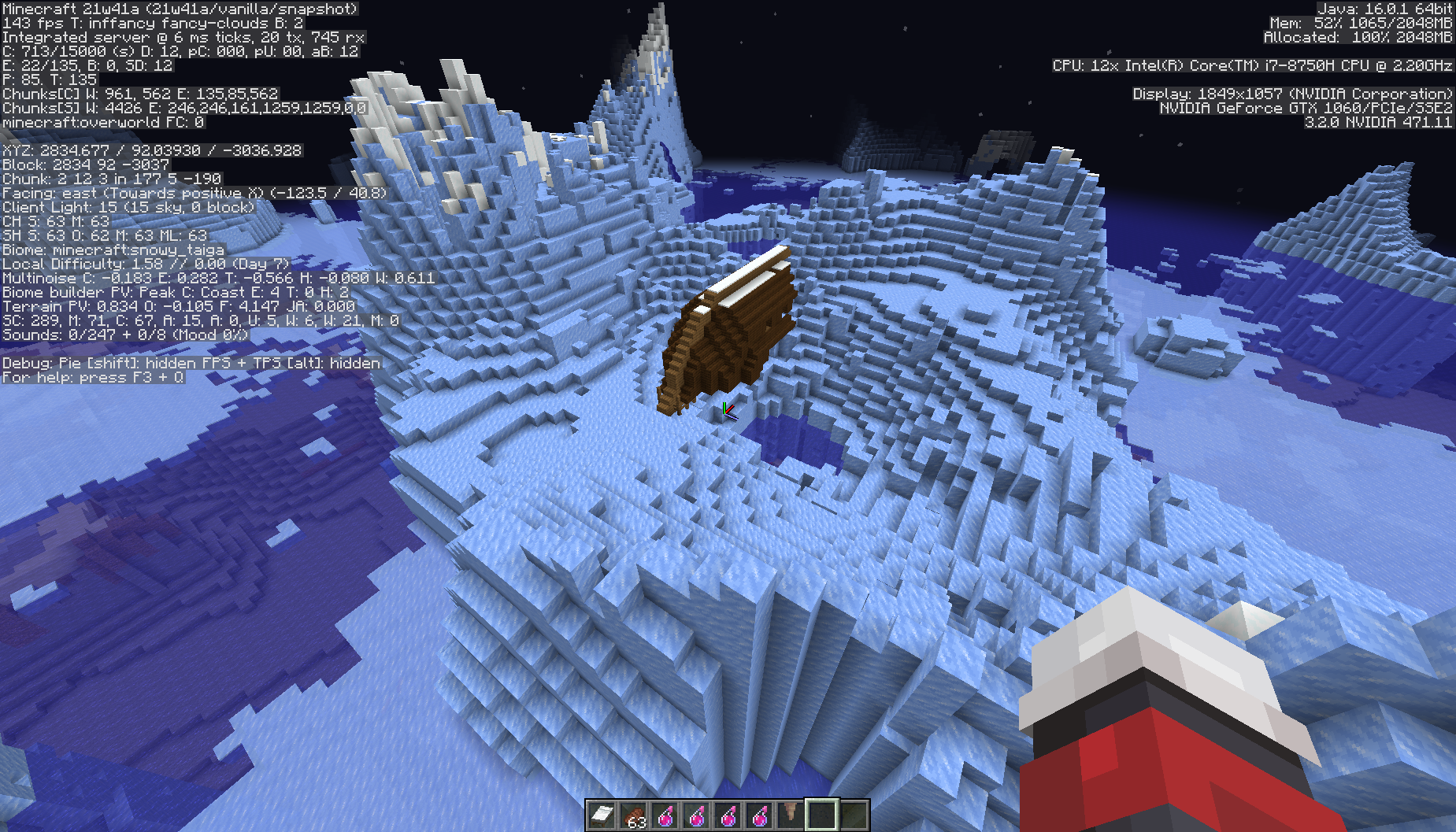 I just stumbled upon an upside-down shipwreck in the specified world seed and coordinates. What the problem with this one is that it is generated abnormally on an incorrect y-axis making it float in the air. It is also very odd to see one in the center of the Frozen Ocean iceberg without any gap, leaving a question to the players how it went inside the surrounding Iceberg without any possible entrances.