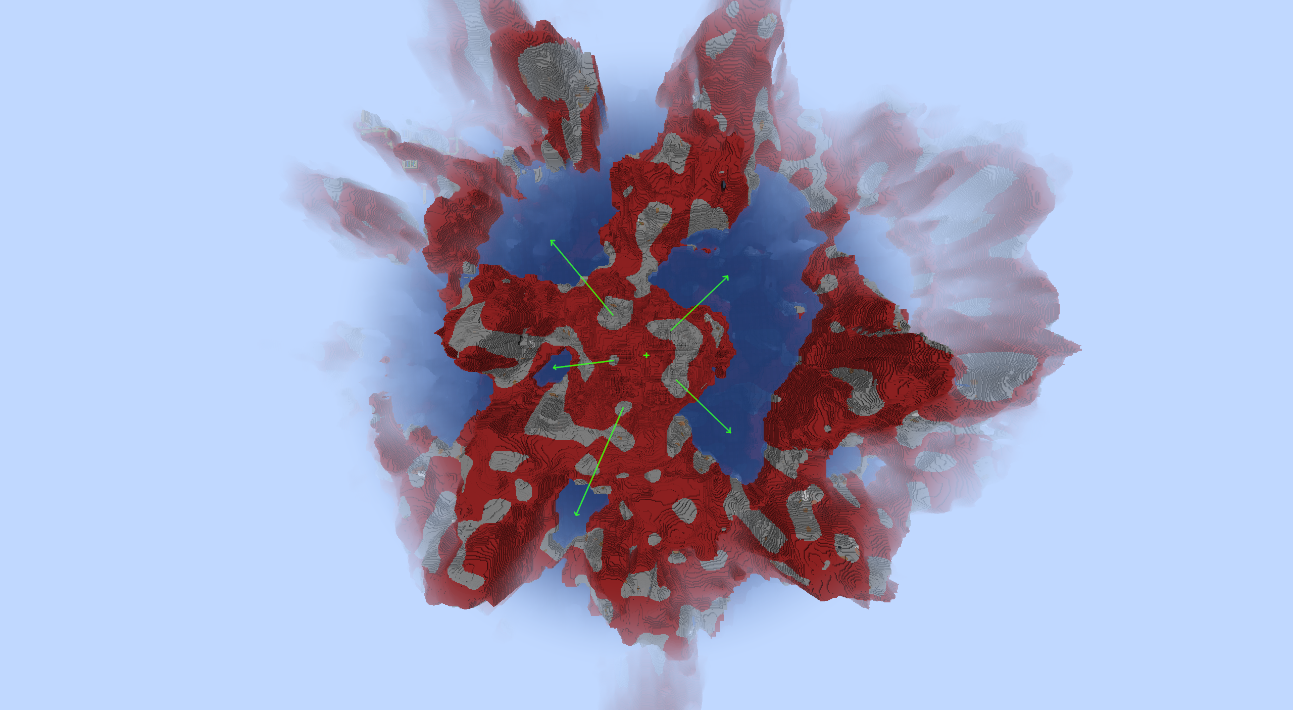 The datapack thus places red concrete anywhere that the continentalness is larger than -0.19. This matches the continentalness value that causes the terrain shaper to generate above water terrain. Therefore we would expect the red concrete placement to match the above water terrain.