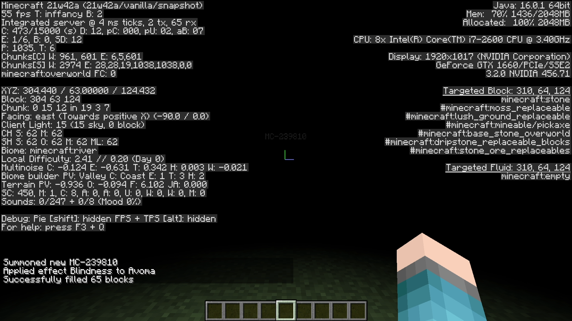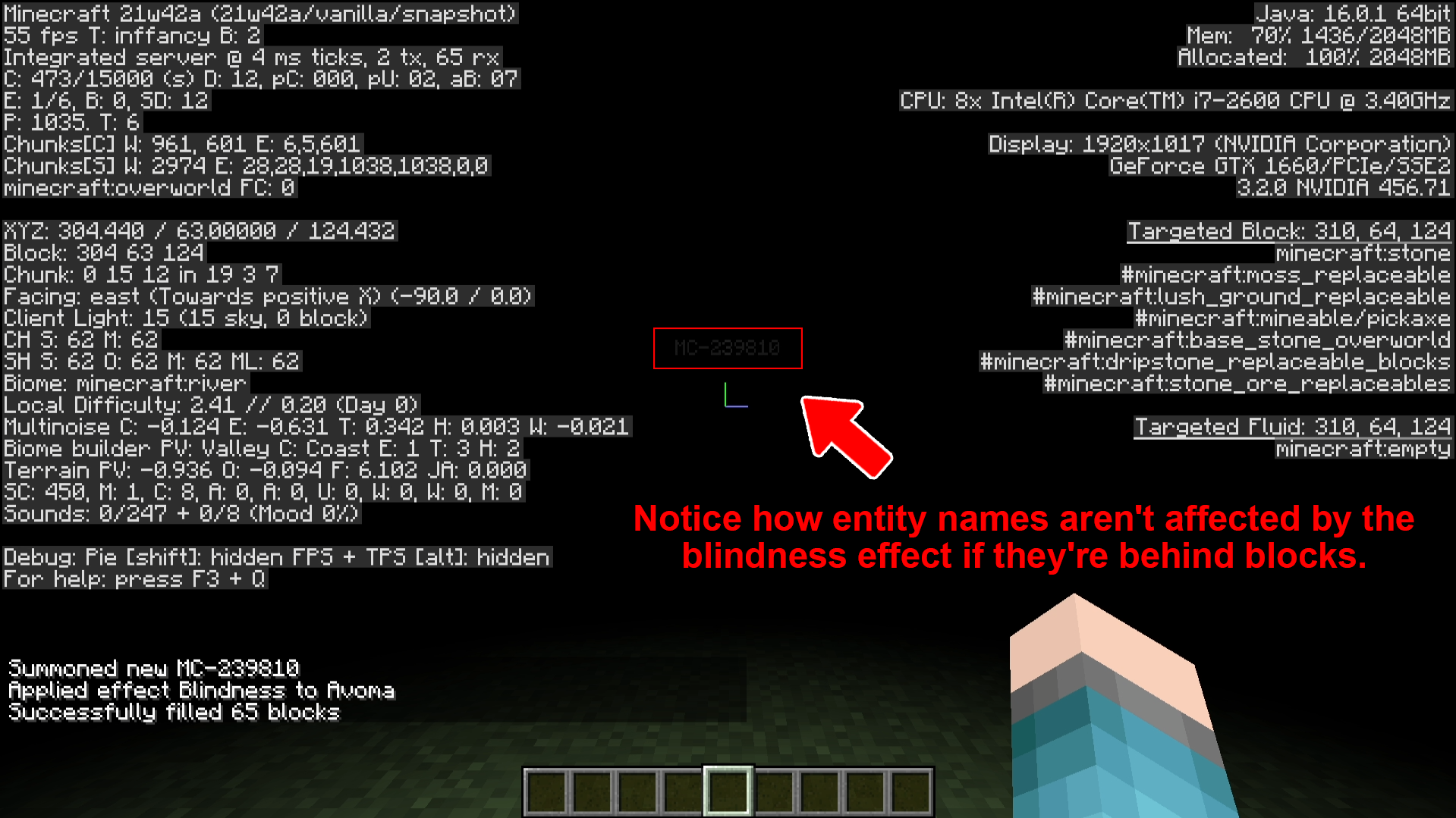 /summon minecraft:husk ~7 ~ ~ {CustomName:"\"MC-239810\"",CustomNameVisible:1b,NoAI:1b,Silent:1b}/effect give @s minecraft:blindness 999999 1 trueTake note of how you correctly aren't able to see the husk's name.