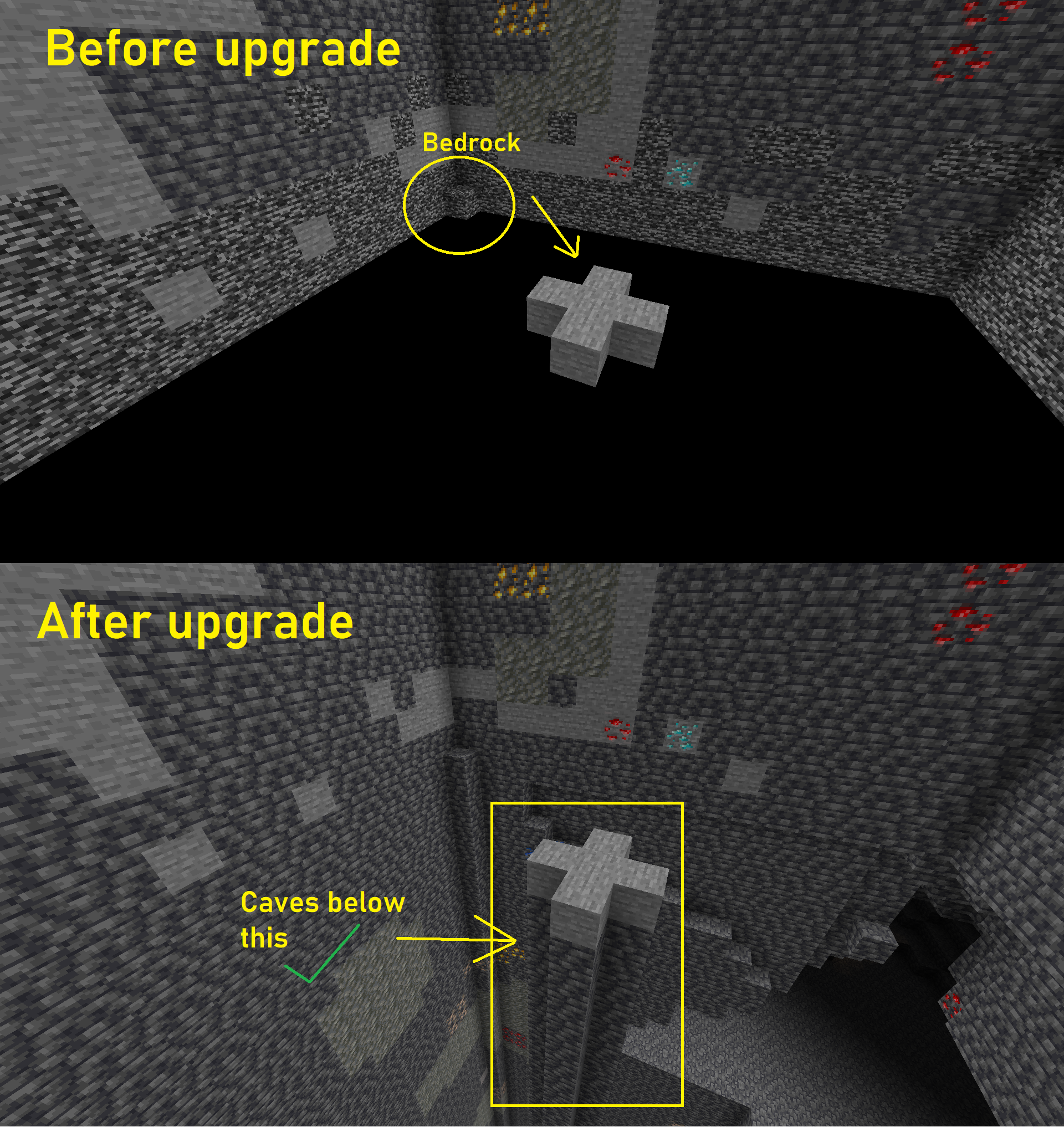 The cause of this issue is when caves are generated below old chunks, the chunk contains no bedrock so it won't attempt to place caves below this chunk since after testing around, the chunk must contain at least 1 block of bedrock at Y=0 in the world for it to fill the bottom with caves. The fix would be detecting if the chunk contains an block at Y=0 instead of detecting only Bedrock.