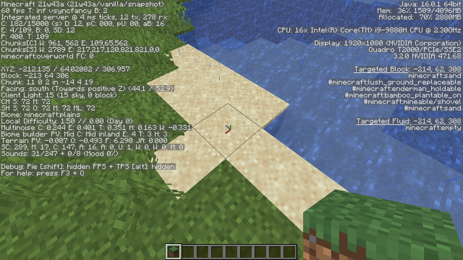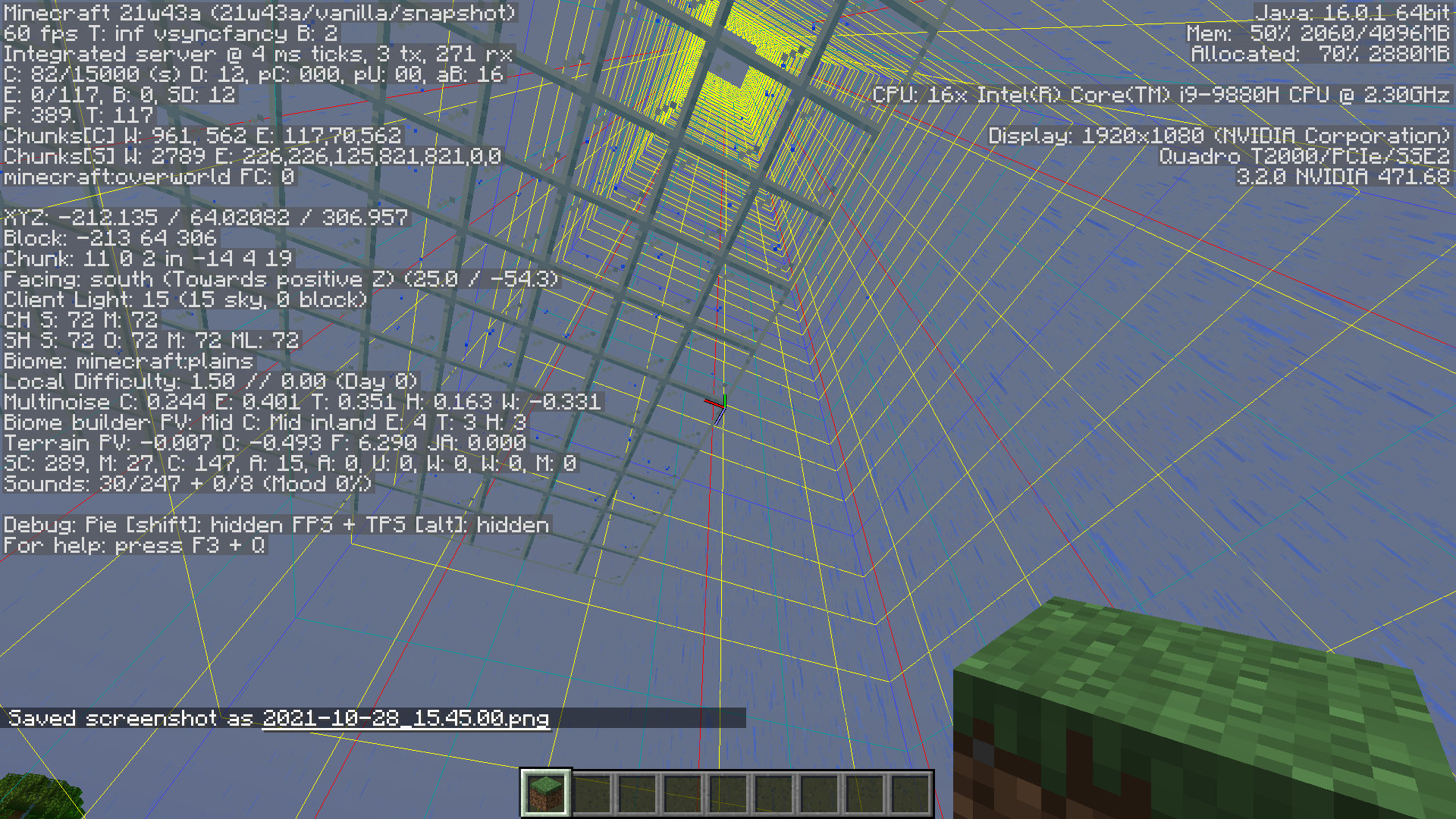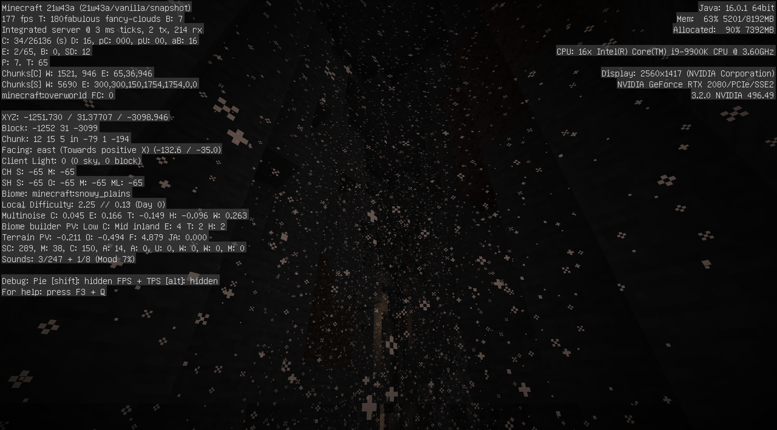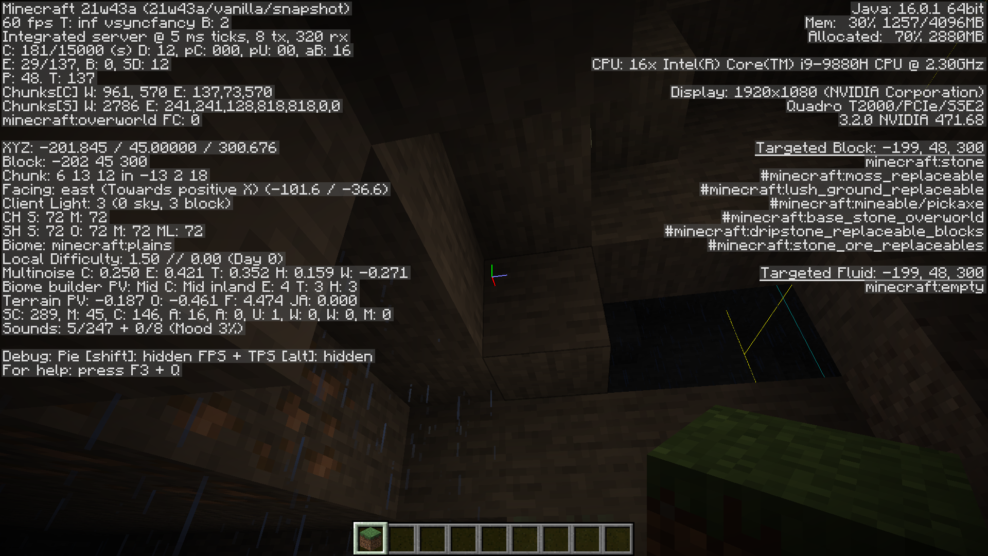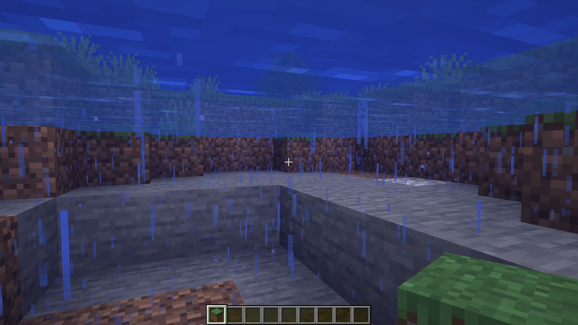 On worlds loaded in 1.17.1, rain and snow appear in structures, caves, and underwater in old chunks when loaded in 21w43a. Chunks generated in 21w43a do not appear to have the issue. The world shown in the last three videos also was not originally created in 1.17.1. The issue does not clear up upon optimizing the world, but placing new blocks will fix the issue for any blocks below. Affected blocks also lack the particles present when rain hits a block.