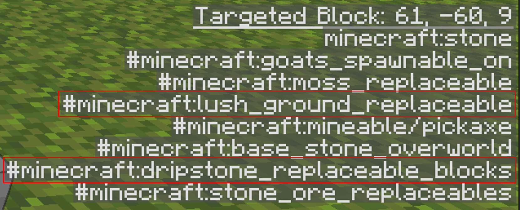 There are inconsistencies within the names for block tags for blocks which can be replaced by other blocks during world generation and other in-game events. For example, #minecraft:lush_ground_replaceable does not have a "_blocks" at the end, but #minecraft:dripstone_replaceable_blocks does.