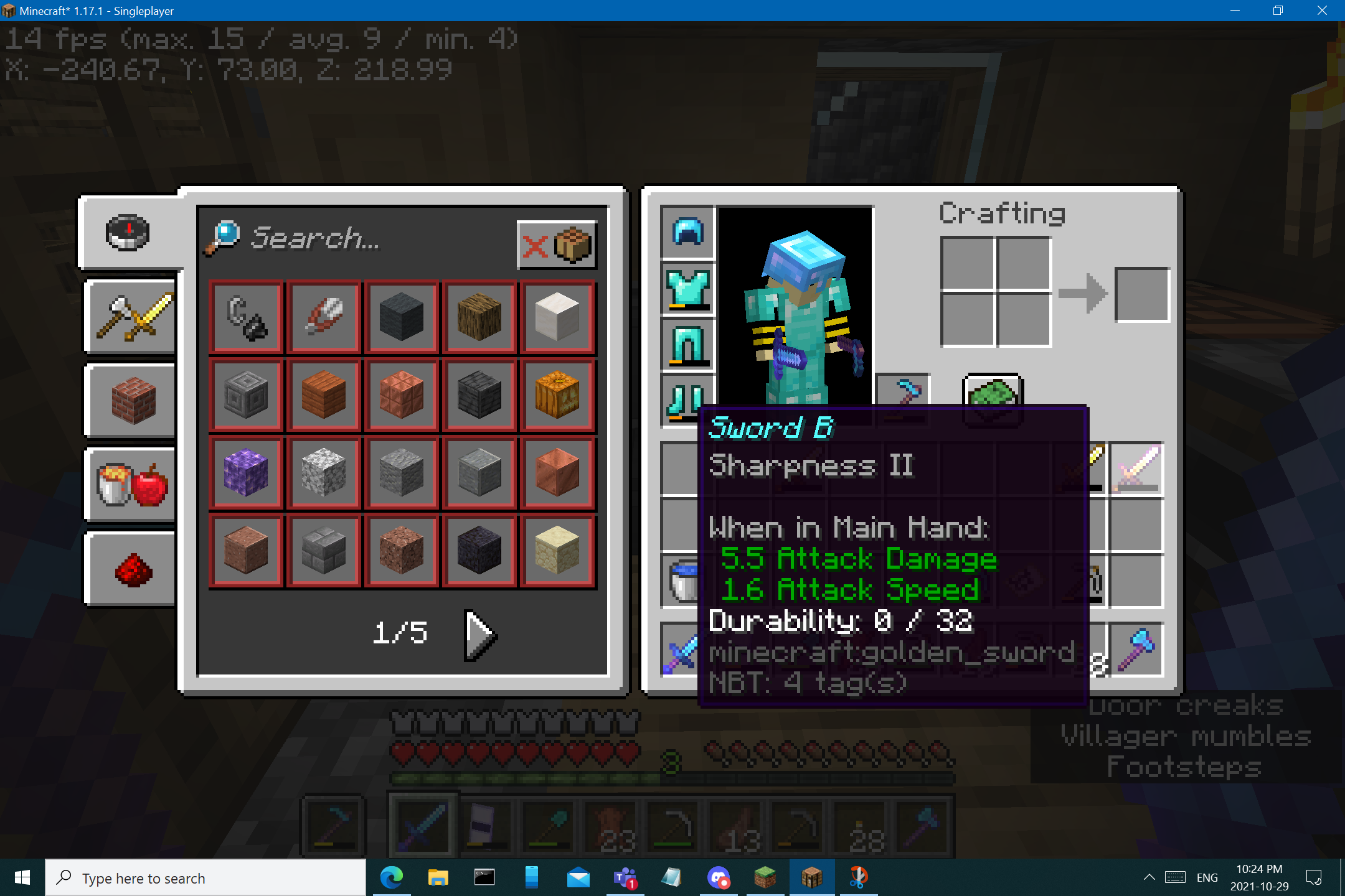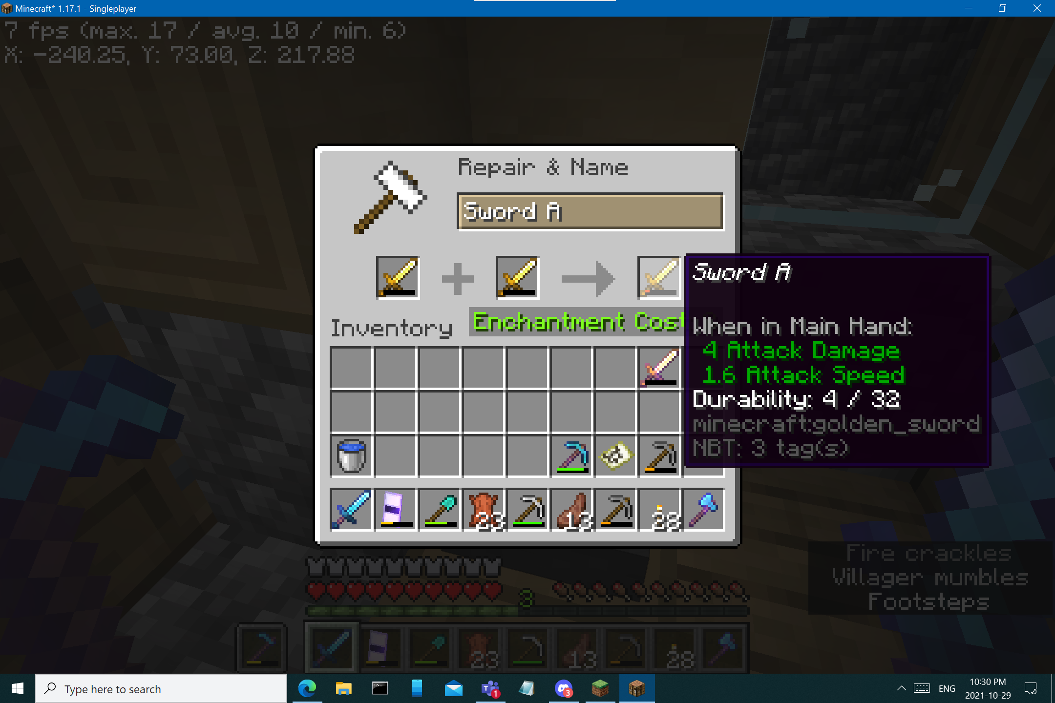 In-game, while killing zombified piglins (used Looting 3, Sharpness 4, Unbreaking 3, Mending 1, Knockback 2 sword), 3 golden swords were dropped. One is enchanted with sharp 2 (swordB), the two others are not enchanted (swordA and swordC). swordA and swordB both have durabilities 0/32 (shown in screenshots "swordA"&"swordB"), which is not correct since the tool breaks at 0 durability. swordC had durability 1/32 (screenshot "swordC"). I renamed the swords from "Golden Sword" to the corresponding names on an anvil, and proceeded to experiment.
