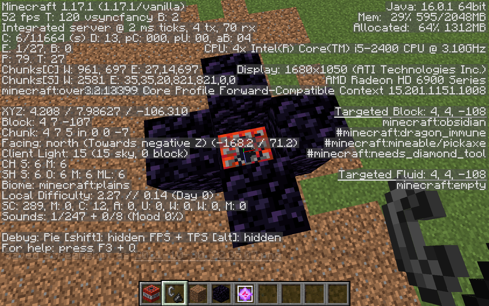 To reproduce this bug, place a TNT block in the air and near the ground. I used dirt blocks in the example. Then, cover all but the top with obsidian. Fly on top of the structure, and prime the TNT. Before the TNT detonates, cover the top with a block of obsidian. After the TNT explodes, several dirt blocks are destroyed.