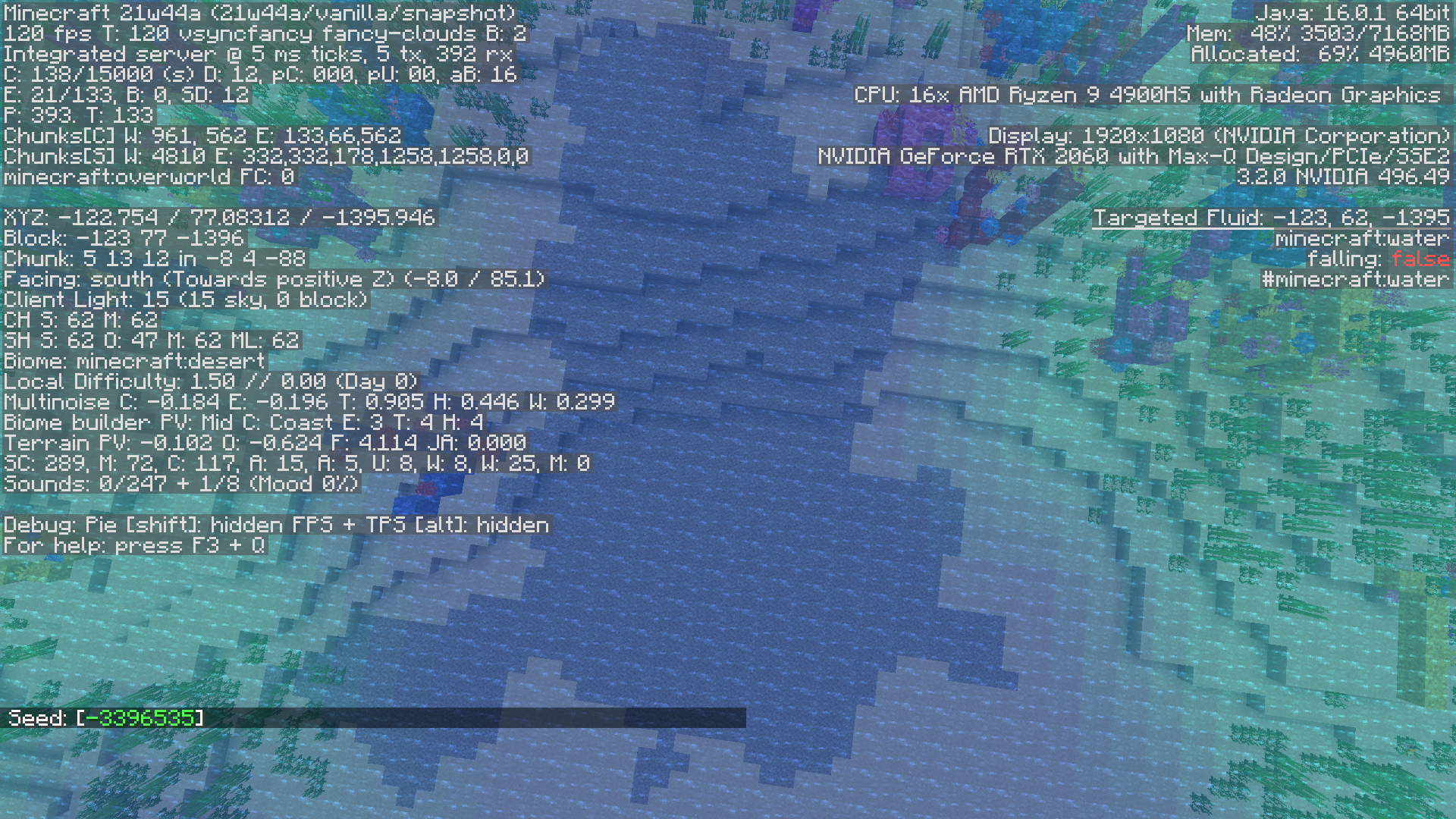 On seed: '7666270795396769282', teleport to these cooridinates: 818 66 -40, and open the F3 screen