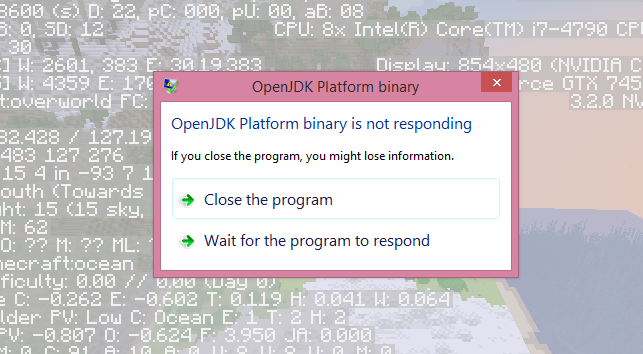 I can create a world, log into it, and fly around to my heart's content with no out of the ordinary framerate issues. I've been scoping out terrain in many new worlds by finding an interesting area in creative, then trying to make maps of it. I produce anywhere from five to ten maps of different chunks and make a wall of glowing item frames to post them on. As I create more maps the framerate drops dramatically, eventually reaching zero before the game freezes (not responding) and crashes with Exit Code: 0. At first I though it was a one time glitch, but I've noticed that it happens every single time once I get to a certain point of mapping my surroundings.