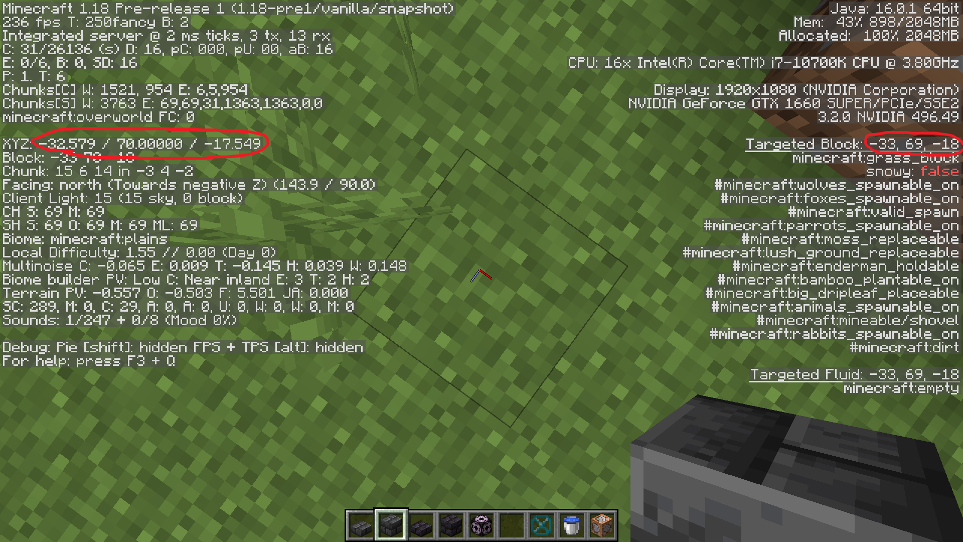 When doing some things with command blocks I noticed that targeted block coordinates did not match the coordinates that the player had when in the same spot. The example in the images shows an offset of -1 in the the X and Z axis. I have found that the source of this offset is that player coordinates go from 0 to -0 but targeted block coordinates go from 0 to -1.