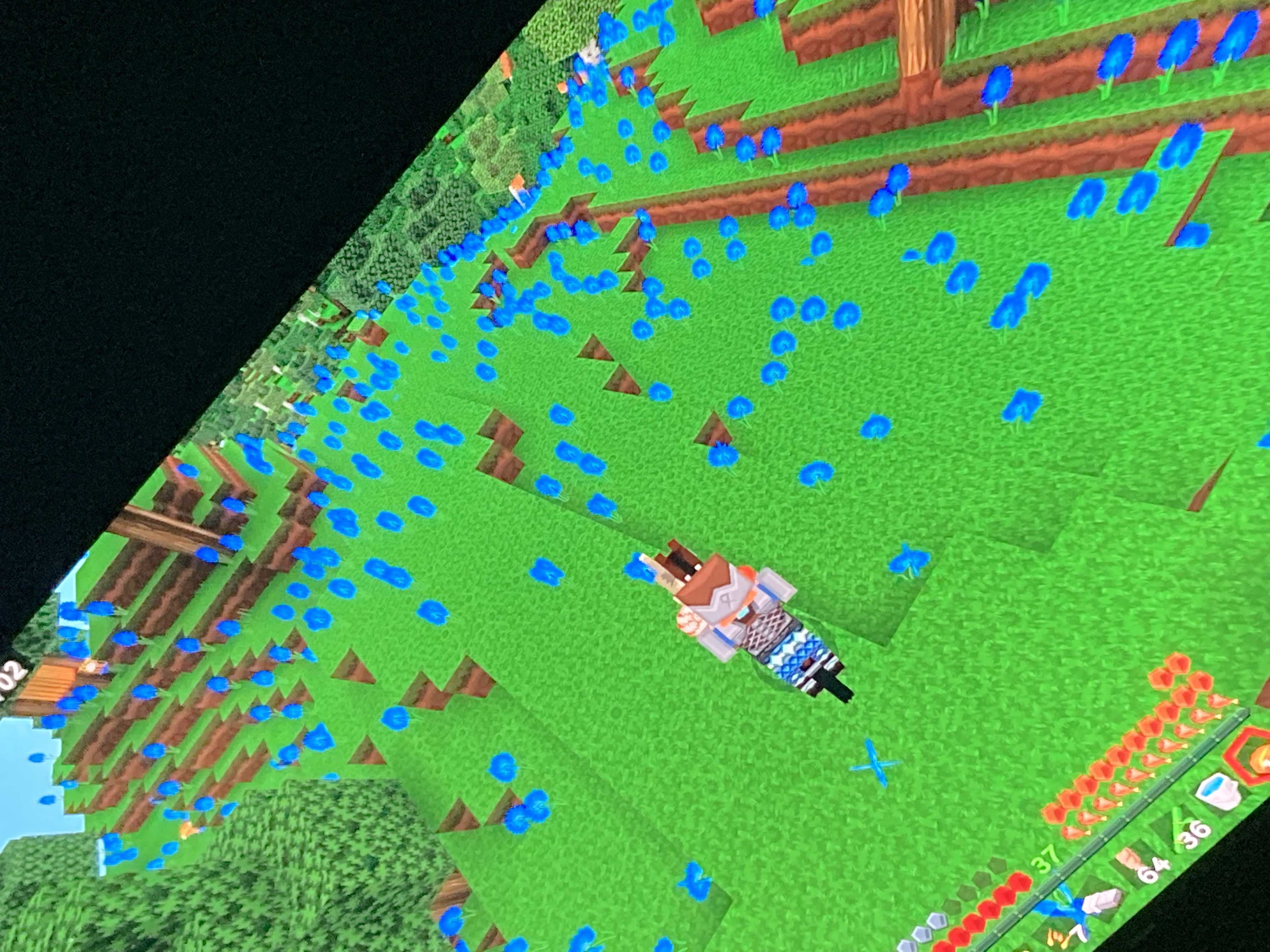 This is a relatively new world that I was exploring, I looked at a mountain far away and it looked really blue-colored so I went to it, and the grass ( tall grass, and short grass) was removed and replaced with cornflowers. The number of beehives that were there was absurd! I counted 4 in the same chunk.