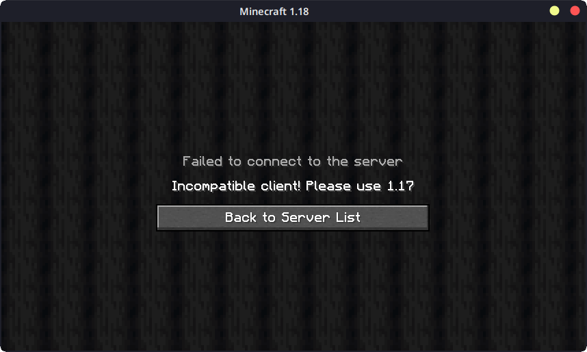 Here's the error I get when attempting to connect to a vanilla 1.17 server. I'm not sure what you have to do to get the "Outdated Server!" message that is mentioned.