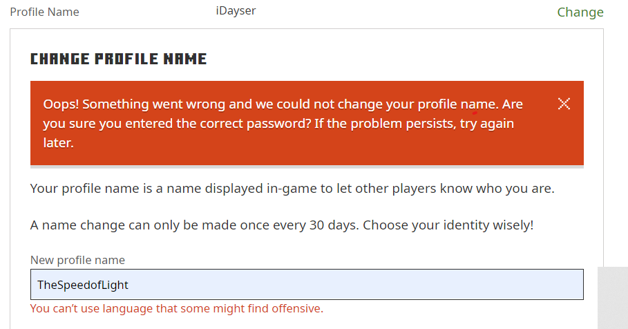 The name I am trying to get, "TheSpeedofLight", has been used previously but is now considered to be "offensive" even though it is completely clean. I would ask that it be fixed so I can change my name. Thanks and sorry for the trouble.