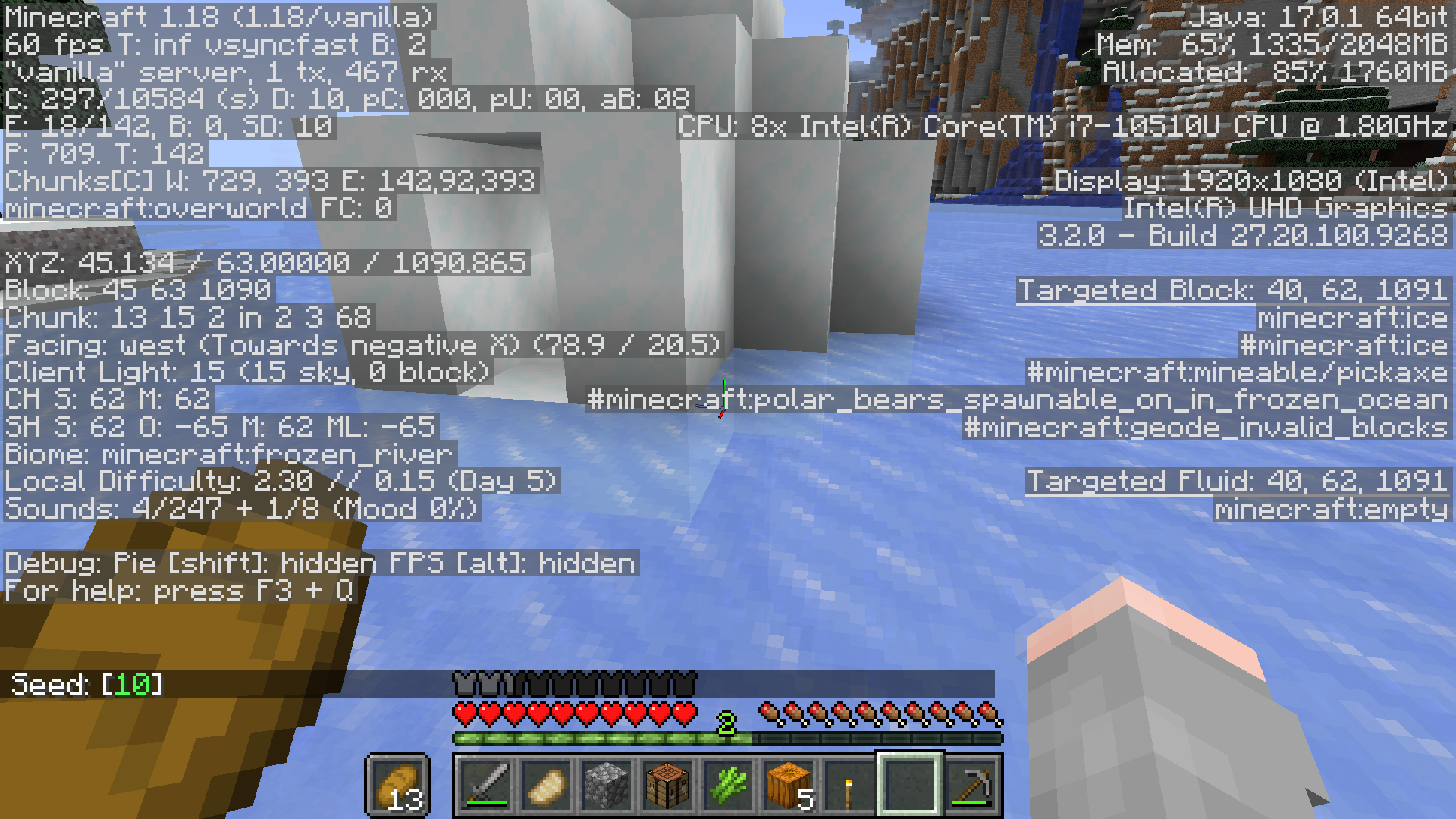 Started a new world using seed 10, and just running along and exploring I found an igloo had generated on the top of the frozen river.