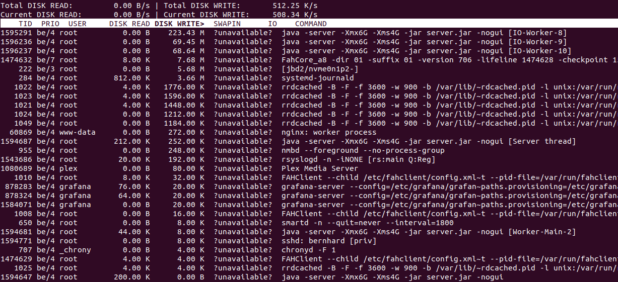 Attached some iotop screenshots. First one created shortly after I started the server, and for the last one, created around 60 minutes after startup, I messed up switching from thread to process view, expecting iotop to summarize the values. Yet, it actually resets the counters, so the values in the last screenshot must be added to the previous one, and the count between 30m and my mess-up is lost.