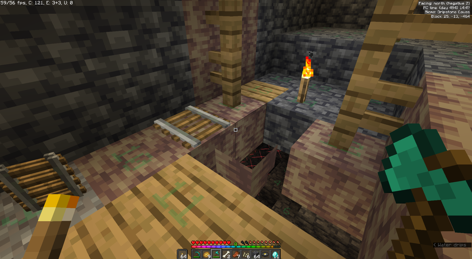 When the dripstone cavern overlaps with mineshafts hanging pointed dripstone can generate hanging from air. Immediately after taking the relevant screenshot, I fell through the floating stelagtite, and while I can understand it not having a bottom texture since it's always supposed to be attached to a full block, it should in my opinion still have collision so that it's walkable in fringe generation cases like this.