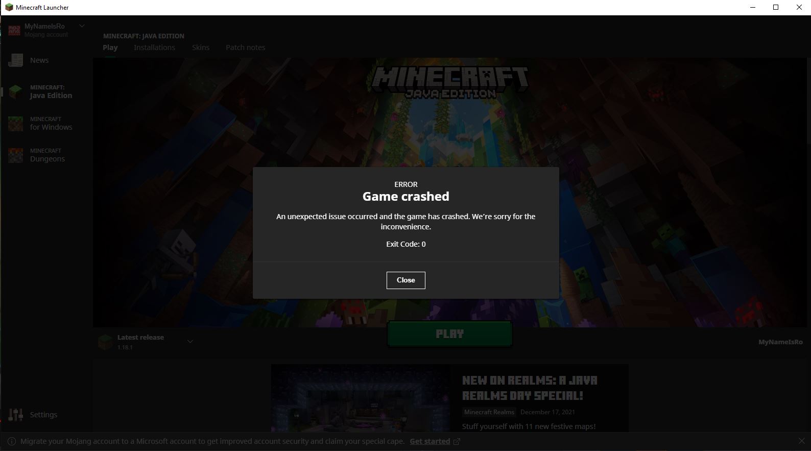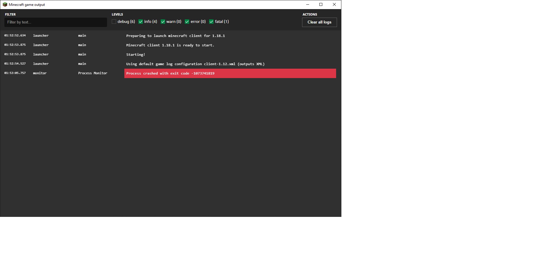 I open the minecraft launcher, click play to open the game, the game tries to open but fails and displays an error code 0. When I open up the output log, the error code is -1073741819.