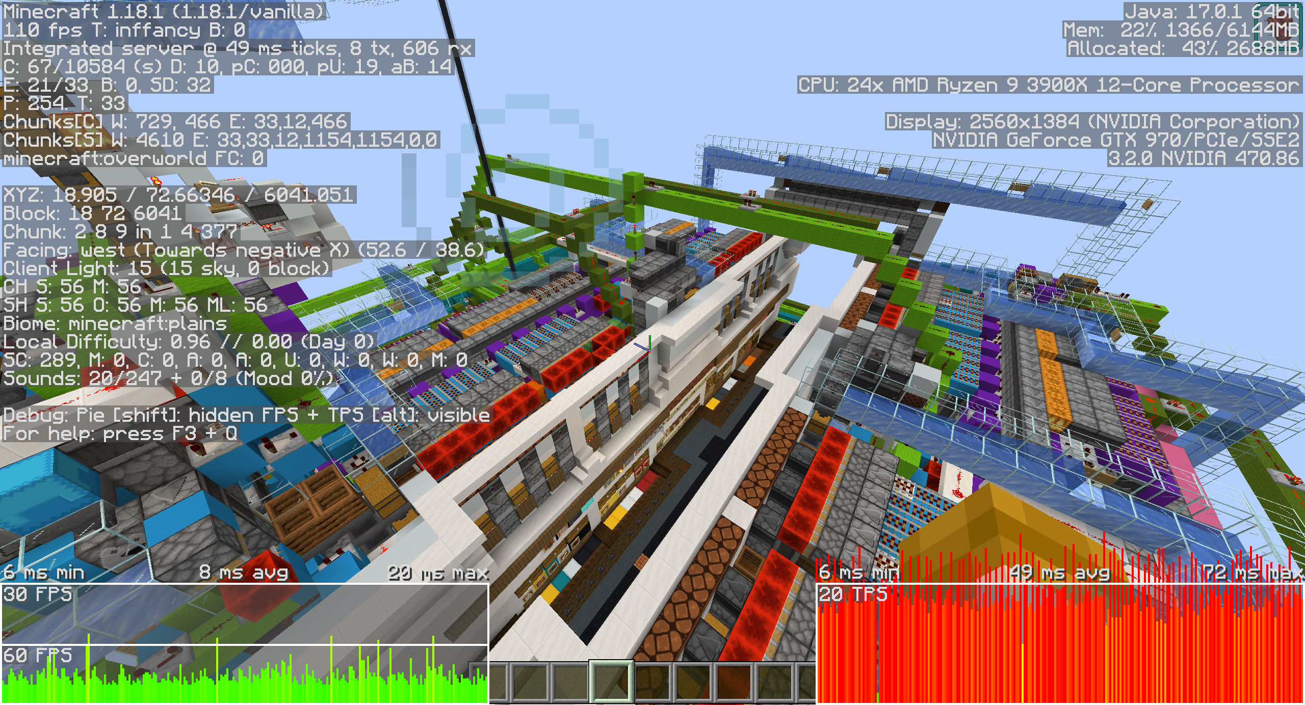 I first discovered this issue when I updated a singleplayer creative world that had a small storage system in it to 1.18.1. I noticed that when I ran that storage system performance was significantly worse then it was 1.17.1. Instead of only consuming 3-5 MSPT like it did in 1.17.1, it was now running at almost 50 MSPT.