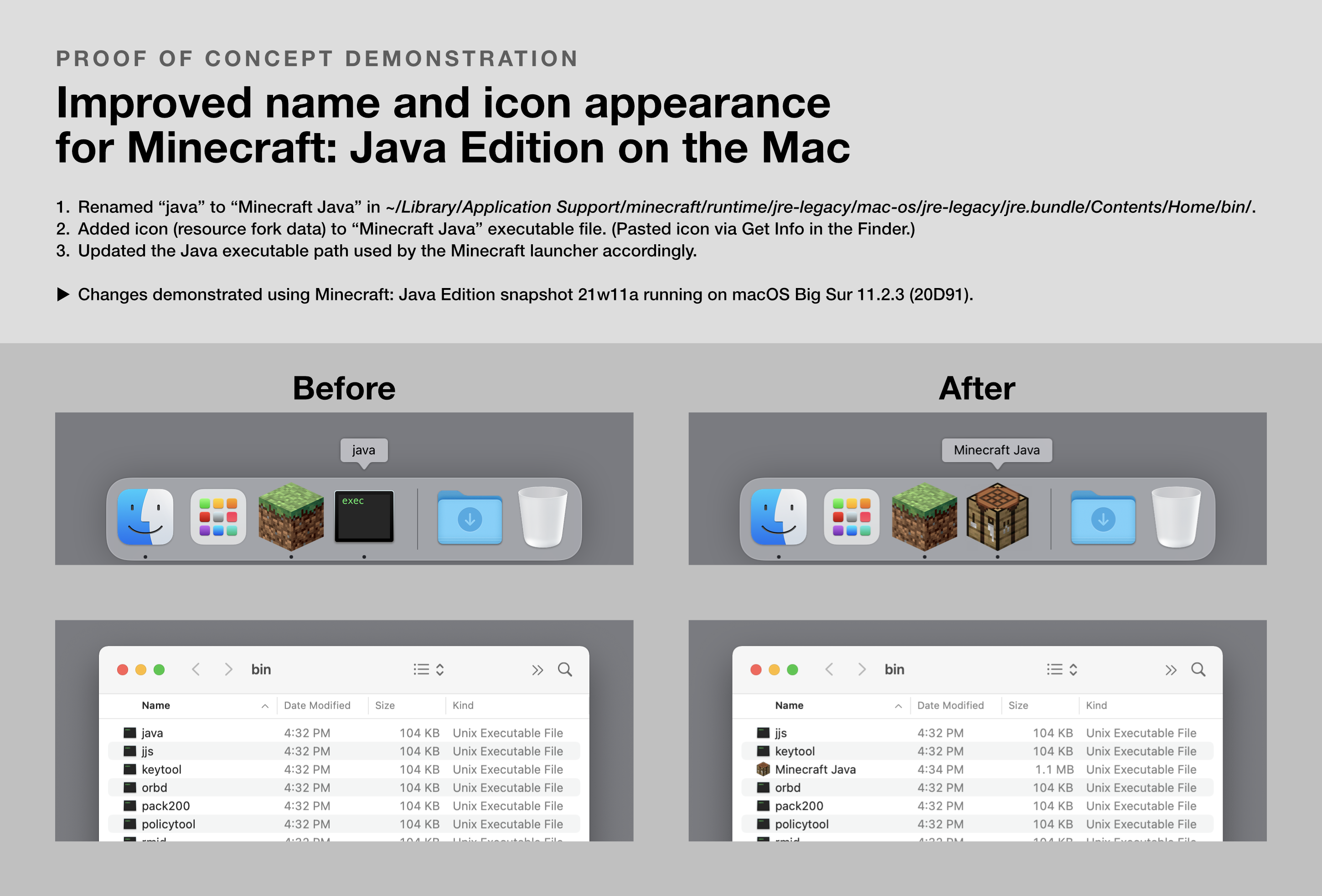 If you are on a mac, open up minecraft 17w43b and look at the icon of the game. The icon will show text saying exec instead of showing the crafting table icon.