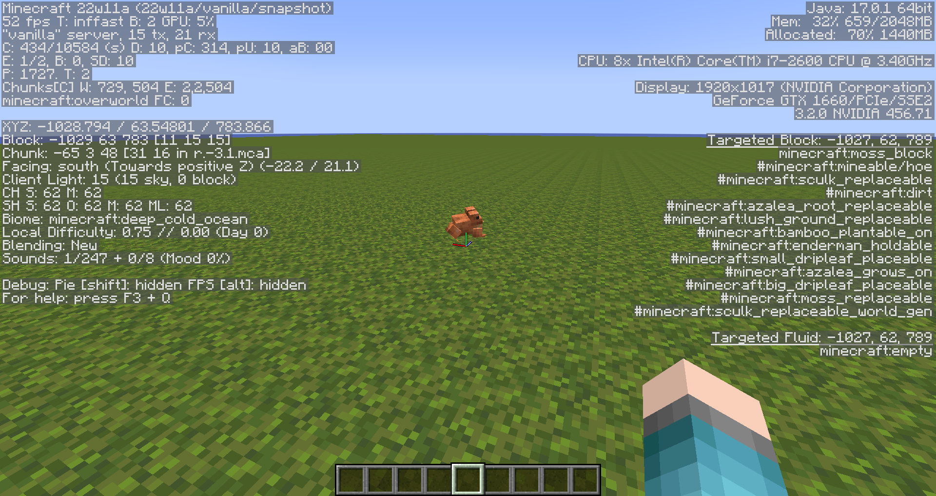 When a given entity's movement speed is altered, its walking animation would also be changed to match the speed at which it moves, however, this isn't the case with frogs. As a result of this problem, frogs can appear as if they're "gliding" along the ground when their movement speed is set to a high value.